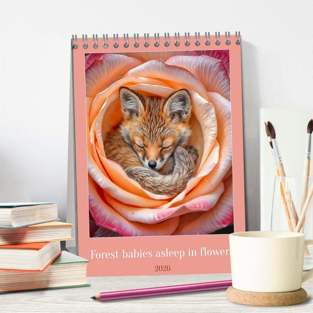 Forest babies asleep in flowers (Desk Calendar 2026 DIN A5 portrait), CALVENDO 12 Month DeskCalendar