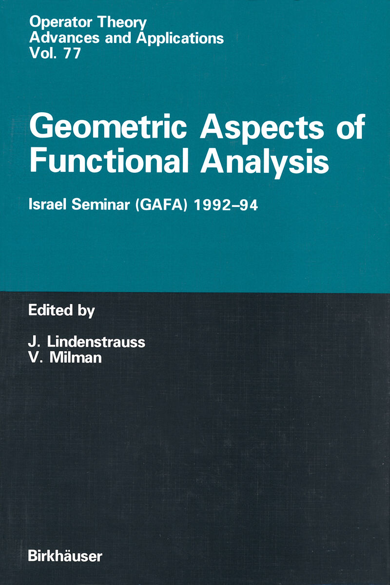 This is the sixth published volume of the Israel Seminar on Geometric Aspects of Functional Analysis. The previous volumes are 1983-84 published privately by Tel Aviv University 1985-86 Springer Lecture Notes, Vol. 1267 1986-87 Springer Lecture Notes, Vol. 131...This is the sixth published volume of the Israel Seminar on Geometric Aspects of Functional Analysis. The previous volumes are 1983-84 published privately by Tel Aviv University 1985-86 Springer Lecture Notes, Vol. 1267 1986-87 Springer Lecture Notes, Vol. 1317 1987-88 Springer Lecture Notes, Vol. 1376 1989-90 Springer Lecture Notes, Vol. 1469 As in the previous vC!lumes the central subject of -this volume is Banach space theory in its various aspects. In view of the spectacular development in infinite-dimensional Banach space theory in recent years (like the solution of the hyperplane problem, the unconditional basic sequence problem and the distortion problem in Hilbert space) it is quite natural that the present volume contains substantially more contributions in this direction than the previous volumes. This volume also contains many important contributions in the "traditional directions" of this seminar such as probabilistic methods in functional analysis, non-linear theory, harmonic analysis and especially the local theory of Banach spaces and its connection to classical convexity theory in IRn. The papers in this volume are original research papers and include an invited survey by Alexander Olevskii of Kolmogorov's work on Fourier analysis (which was presented at a special meeting on the occasion of the 90th birthday of A. N. Kol mogorov). We are very grateful to Mrs. M. Hercberg for her generous help in many directions, which made the publication of this volume possible. Joram Lindenstrauss, Vitali Milman 1992-1994 Operator Theory: Advances and Applications, Vol.