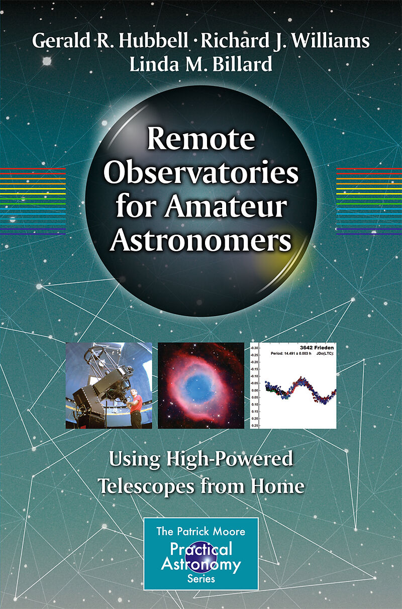 Remote Observatories for Amateur Astronomers Using High-Powered Telescopes from Home, by Jerry Hubbell, Rich Williams, and Linda Billard, is a unique contribution centering on computer-controlled private observatories owned by amateur astronomers and commercialized professionalamateur observatories where observing time to collect data can be purchased. Before this book, trying to piece together all of the necessary elements and processes that make up a remotely operated observatory was daunting. The authors and contributors have provided, in this single publication, a wealth of information gained from years of experience that will save you considerable money and countless hours in trying to develop such an observatory.