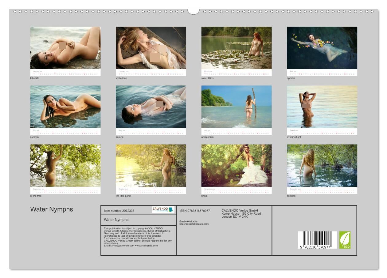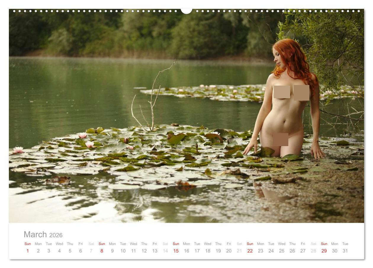 This calendar combines in a sensual way female nudes with the element water. The models are shown in elegant poses at small streams, romantic lily ponds and solitary lakes in nature.