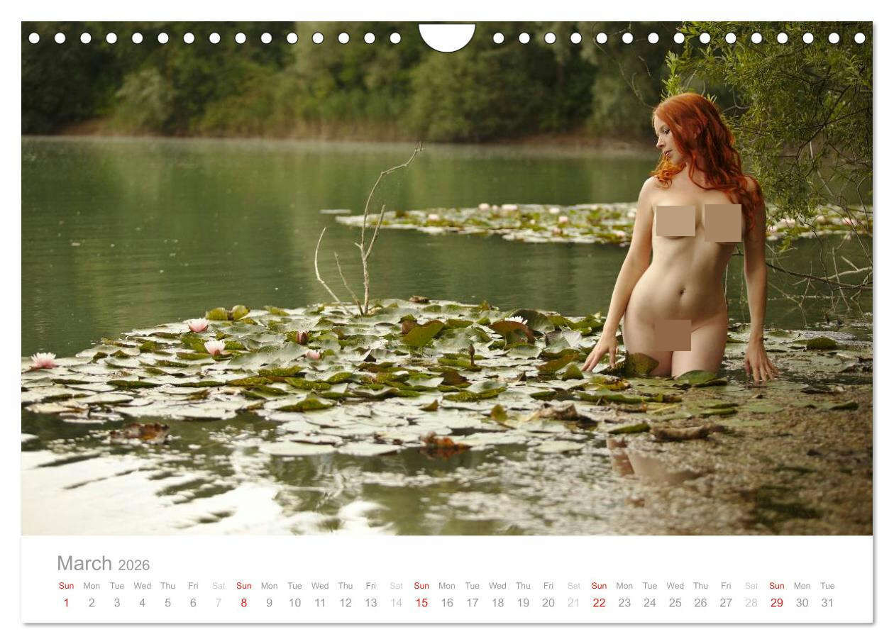 This calendar combines in a sensual way female nudes with the element water. The models are shown in elegant poses at small streams, romantic lily ponds and solitary lakes in nature.