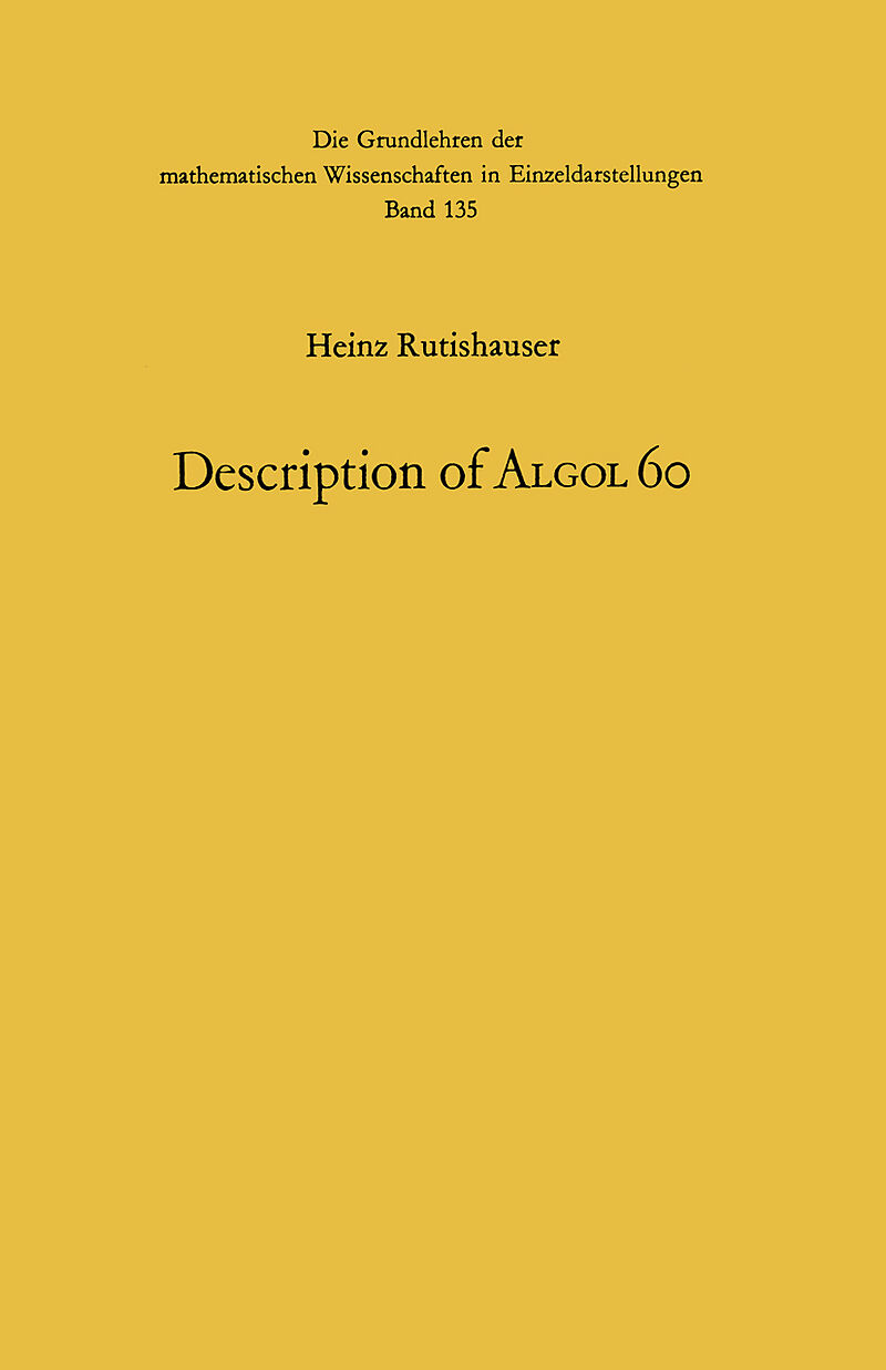 I Introduction.- § 1. The Concept of Automatic Programming.- § 2. Historical Remarks on Algorithmic Languages.- § 3. The Algol Conferences of 1958, 1960, 1962.- § 4. Algol Dialects and the IFIP Subset of Algol 60.- § 5. Preliminary Definition of Algol.- II Basic Concepts.- § 6. Auxiliary Conventions.- § 7. The Basic Symbols of Algol.- § 8. Values.- § 9. Quantities and their Names.- § 10. Numerical Constants.- § 11. Labels.- § 12. Strings.- § 13. Comments.- III Expressions.- § 14. Variables.- § 15. Function Designators.- § 16. Simple Arithmetic Expressions.- § 17. Relations.- § 18. Simple Boolean Expressions.- § 19. Conditional Expressions.- § 20. Subscript Expressions.- IV Statements.- § 21. Assignment Statements.- § 22. Sequences of Statements.- § 23. Labelled Statements.- § 24. The Dummy Statement.- § 25. Goto-Statements.- § 26. Procedure Statements I.- § 27. Compound Statements and Blocks.- § 28. The If-Statement.- § 29. The If-Else-Statement.- § 30. The For-Statement.- V Miscellaneous Applications.- § 31. Algebraic Problems.- § 32. Interpolation and Numerical Quadrature.- § 33. Numerical Integration of Differential Equations.- § 34. Least Square Problems.- §35. Computations Related to Continued Fractions.- § 36. Considerations Concerning Computer Limitations.- §37. Data Processing Applications.- VI Declarations.- § 38. Type Declarations.- § 39. Array Declarations.- § 40. Switch Declarations.- § 41. Procedure Declarations I.- §42. Semantics of Blocks.- §43. Entire Programs.- VII Procedures.- § 44. Procedure Declarations II.- §45. Procedure Statements II.- § 46. Function Procedures and their Use.- § 47. Code Procedures.- § 48. Parameter Procedures.- VIII Input and Output.- § 49. The Standard I/O-Procedures of Algol.- §50. Applications of Procedures insymbol, outsymbol.- §51. Use of inarray, outarray for Auxiliary Storage.- Appendix A.- § 52. The Jensen Device.- 52.1. The full name-concept.- 52.2. The Jensen device.- 52.3. Bound variables.- § 53. Conclusion.- 53.1. Church's lambda notation.- 53.2. The lambda notation for arrays.- 53.3. Syntax of the proposed extension.- 53.4. Semantics of the proposed extension.- 53.5. Applications of the proposed extension.- Appendix B. The IFIP-Reports on Algol.- References.