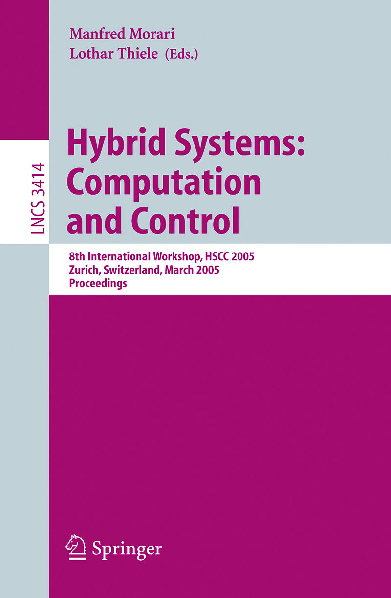 This volume contains the proceedings of the 8th Workshop on Hybrid S- tems: Computation and Control(HSCC2005)heldinZurich,Switzerlandduring March 9 11, 2005. The annual workshop on hybrid systems attracts researchers from academia and industry interested in mo...This volume contains the proceedings of the 8th Workshop on Hybrid S- tems: Computation and Control(HSCC2005)heldinZurich,Switzerlandduring March 9 11, 2005. The annual workshop on hybrid systems attracts researchers from academia and industry interested in modeling, analysis, and implemen- tion of dynamic and reactive systems involving both discrete and continuous - haviors. The previous workshops in the HSCC series were held in Berkeley, USA (1998),Nijmegen,TheNetherlands(1999),Pittsburgh,USA(2000),Rome,Italy (2001), Palo Alto, USA (2002), Prague, Czech Republic (2003), and Philad- phia, USA (2004). This year s HSCC was technically co-sponsored by the IEEE Control Systems Society. The program consisted of 3 invited talks and 40 regular papers selected from 91 regular submissions. The program covered topics such as tools for analysis and veri?cation, control and optimization, modeling, engineering applications, and emerging directions in programming language support and implementation. We would like to thank the Program Committee members and reviewers for anexcellentjobofevaluatingthesubmissionsandparticipatingintheonlineP- gram Committee discussions. Special thanks go to Markus P. J. Fromherz (Palo Alto Research Center, USA), Edward A. Lee (University of California, Berkeley, USA), and Pablo A. Parrilo (Massachusetts Institute of Technology, USA) for their participation as invited speakers. We are also grateful to the Steering C- mitteeforhelpfulguidanceandsupport. Manyotherpeopleworkedhardtomake the HSCC 2005 a success. We would like to thank Frank J. Christophersen and Ernesto Wandeler, the Publicity Chairs (with the help of Urban M ader); M- tine D Emma and Monica Fricker for local arrangements; and Frank J. Chris- phersen for putting together the proceedings.