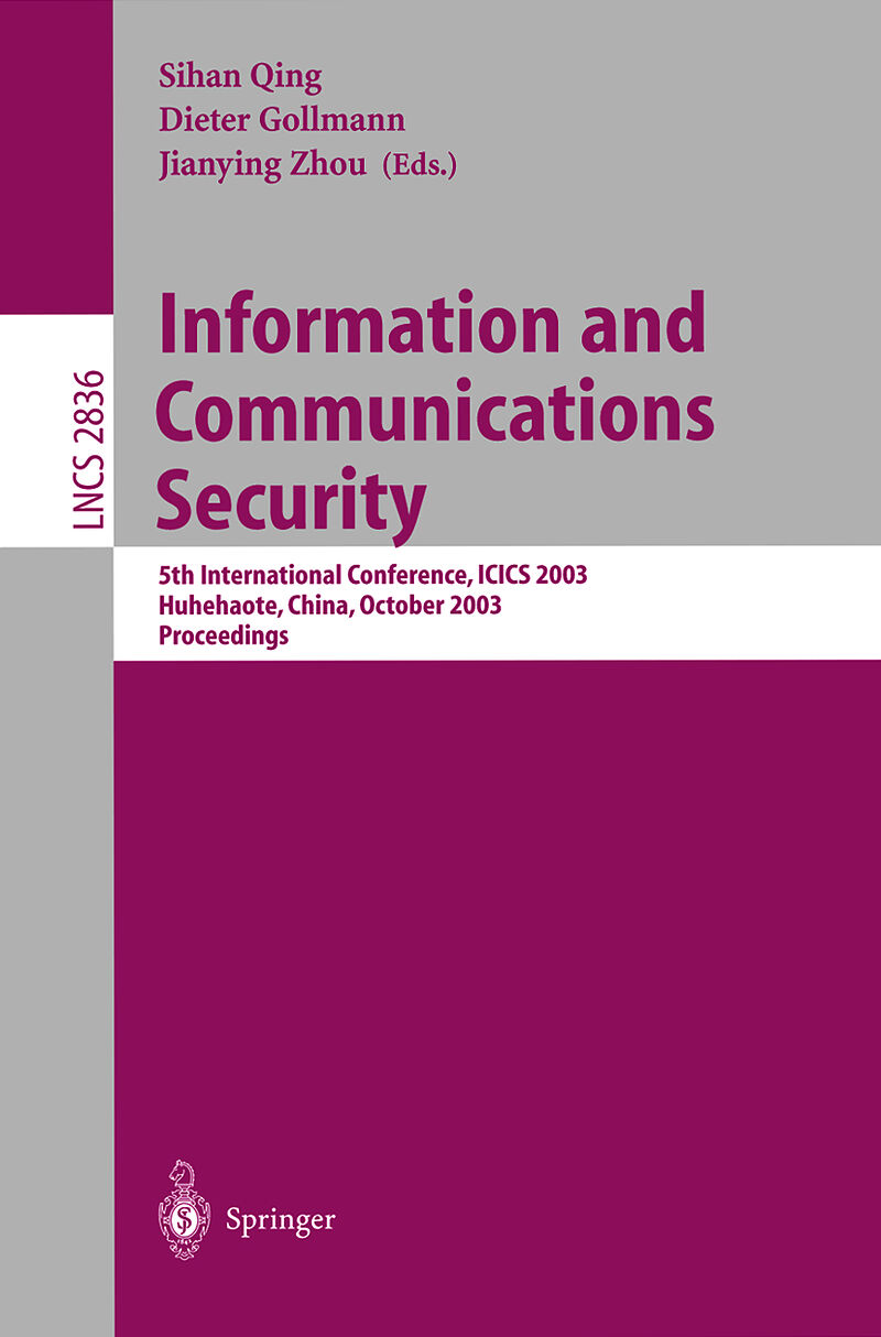 ICICS 2003, the Fifth International Conference on Information and C- munication Security, was held in Huhehaote city, Inner Mongolia, China, 1013 October 2003. Among the preceding conferences, ICICS'97 was held in B- jing, China, ICICS'99 in Sydney, Australia,...ICICS 2003, the Fifth International Conference on Information and C- munication Security, was held in Huhehaote city, Inner Mongolia, China, 1013 October 2003. Among the preceding conferences, ICICS'97 was held in B- jing, China, ICICS'99 in Sydney, Australia, ICICS 2001 in Xi'an, China, and ICICS 2002,in Singapore.TheproceedingswerereleasedasVolumes1334,1726, 2229, and 2513 of the LNCS series of Springer-Verlag, respectively. ICICS 2003 was sponsored by the Chinese Academy of Sciences (CAS), the National Natural Science Foundation of China, and the China Computer F- eration. The conference was organized by the Engineering Research Center for Information Security Technology of the Chinese Academy of Sciences (ERCIST, CAS) in co-operation with the International Communications and Information Security Association (ICISA). The aim of the ICICS conferences has been to o?er the attendees the - portunity to discuss the state-of-the-art technology in theoretical and practical aspects of information and communications security. The response to the Call forPaperswassurprising.WhenwewerepreparingtheconferencebetweenApril and May, China, including the conference venue, Huhehaote City, was ?ghting against SARS. Despite this 176 papers were submitted to the conference from 22 countries and regions, and after a competitive selection process, 37 papers from 14 countries and regions were accepted to appear in the proceedings and be presented at ICICS 2003. We would like to take this opportunity to thank all those who submitted papers to ICICS 2003 for their valued contribution to the conference.