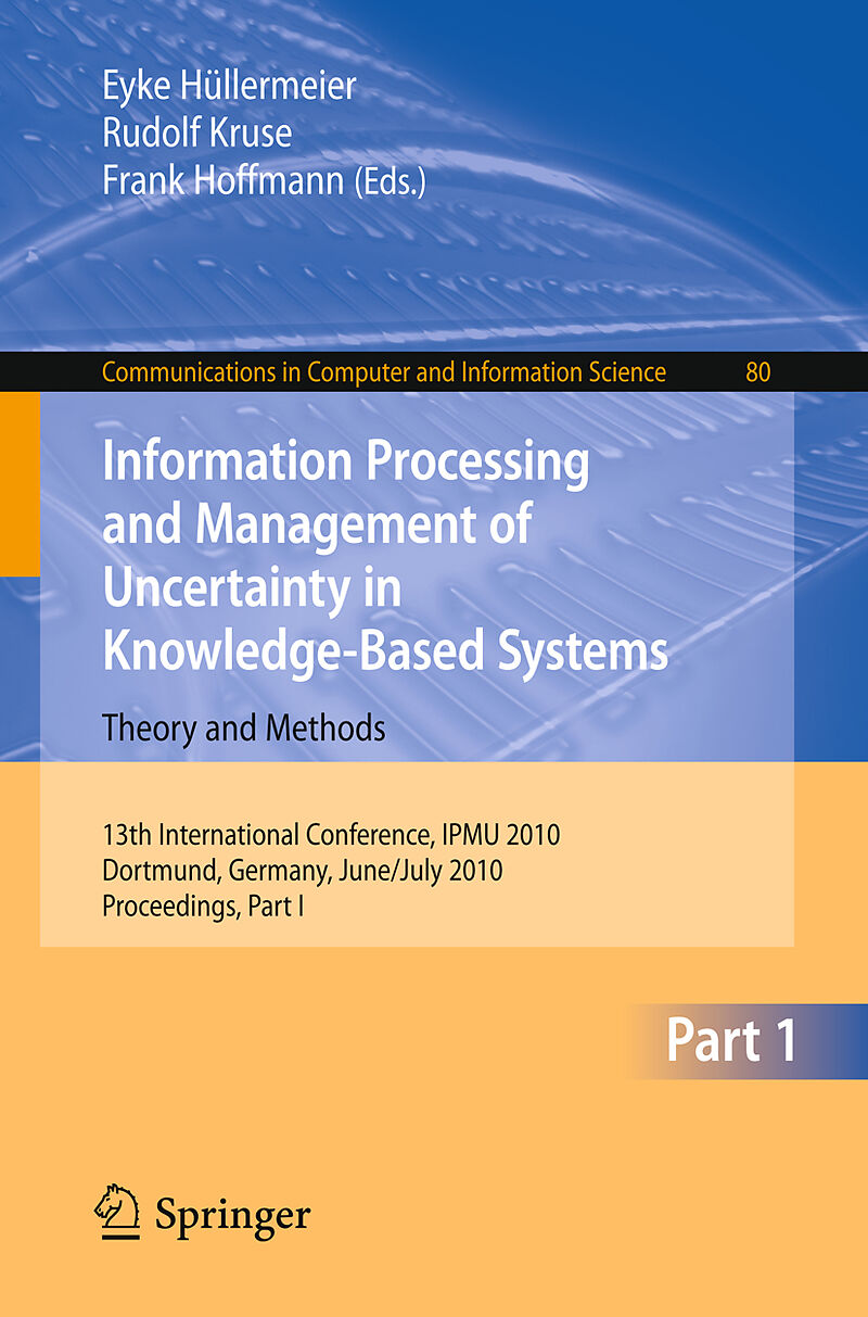 The International Conference on Information Processing and Management of - certainty in Knowledge-Based Systems, IPMU, is organized every two years with the aim of bringing together scientists working on methods for the management of uncertainty and aggregatio...The International Conference on Information Processing and Management of - certainty in Knowledge-Based Systems, IPMU, is organized every two years with the aim of bringing together scientists working on methods for the management of uncertainty and aggregation of information in intelligent systems. Since 1986, this conference has been providing a forum for the exchange of ideas between th theoreticians and practitioners working in these areas and related ?elds. The 13 IPMU conference took place in Dortmund, Germany, June 28July 2, 2010. This volume contains 79 papers selected through a rigorous reviewing process. The contributions re?ect the richness of research on topics within the scope of the conference and represent several important developments, speci?cally focused on theoretical foundations and methods for information processing and management of uncertainty in knowledge-based systems. We were delighted that Melanie Mitchell (Portland State University, USA), Nihkil R. Pal (Indian Statistical Institute), Bernhard Sch¨ olkopf (Max Planck I- titute for Biological Cybernetics, Tubing ¨ en, Germany) and Wolfgang Wahlster (German Research Center for Arti?cial Intelligence, Saarbruc ¨ ken) accepted our invitations to present keynote lectures. Jim Bezdek received the Kamp´ede F´ eriet Award, granted every two years on the occasion of the IPMU conference, in view of his eminent research contributions to the handling of uncertainty in clustering, data analysis and pattern recognition.