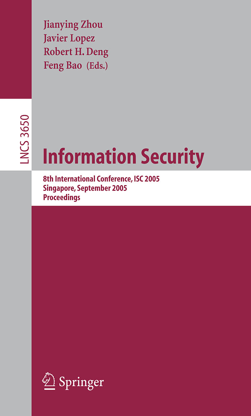 This volume contains the proceedings of the 8th International Information - curity Conference (ISC 2005), which took place in Singapore, from 20th to 23rd September 2005. ISC 2005 brought together individuals from academia and - dustry involvedin manyresearchd...This volume contains the proceedings of the 8th International Information - curity Conference (ISC 2005), which took place in Singapore, from 20th to 23rd September 2005. ISC 2005 brought together individuals from academia and - dustry involvedin manyresearchdisciplines of information security to foster the exchange of ideas. During recent years this conference has tried to place special emphasis on the practical aspects of information security, and since it passed from being an international workshop to being an international conference in 2001, it has become one of the most relevant forums at which researchers meet and discuss emerging security challenges and solutions. Advised by the ISC Steering Committee, and in order to provide students with more opportunities for publication, ISC 2005 accepted extra student papers - sides the regular papers. The initiative was very well accepted by the young sector of the scienti?c community, and we hope that the success of this idea will remainfornextISCevents. AnotherimportantfactorforthesuccessofISC2005 was that selected papers in the proceedings will be invited for submission to a special issue of the InternationalJournalof InformationSecurity. The result was an incredible response to the call for papers; we received 271 submissions, the highest since ISC events started. It goes without saying that the paper selection process was more competitive and di?cult than ever before only 33 regular papers were accepted, plus 5 student papers for a special student session.