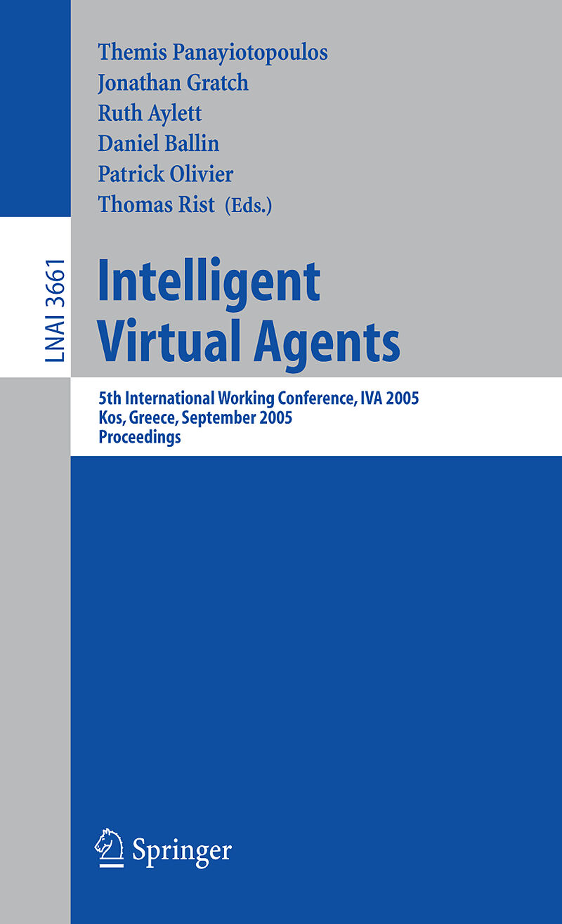 The origin of the Intelligent Virtual Agents conference dates from a successful workshop on Intelligent Virtual Environments held in Brighton at the 13th European Conference on Artificial Intelligence (ECAI'98). This workshop was followed by a second one held ...The origin of the Intelligent Virtual Agents conference dates from a successful workshop on Intelligent Virtual Environments held in Brighton at the 13th European Conference on Artificial Intelligence (ECAI'98). This workshop was followed by a second one held in Salford in Manchester in 1999. Subsequent events took place in Madrid, Spain in 2001 and Irsee, Germany in 2003 and attracted participants from both sides of the Atlantic as well as Asia. th This volume contains the proceedings of the 5 International Working Conference on Intelligent Virtual Agents, IVA 2005, held on Kos Island, Greece, September 1214, 2005, which highlighted once again the importance and vigor of the research field. A half-day workshop under the title Socially Competent IVA's: We are not alone in this (virtual) world! also took place as part of this event. IVA 2005 received 69 submissions from Europe, North and South America, Africa and Asia. The papers published here are the 26 full papers and 14 short papers presented at the conference, as well as one-page descriptions of the 15 posters and the descriptions of the featured invited talks by Prof. Justine Cassell, of Northwestern University and Prof. Kerstin Dautenhahn, of the University of Hertfordshire. We would like to thank a number of people that have contributed to the success of this conference. First of all, we thank the authors for their high-quality work and their willingness to share their ideas.