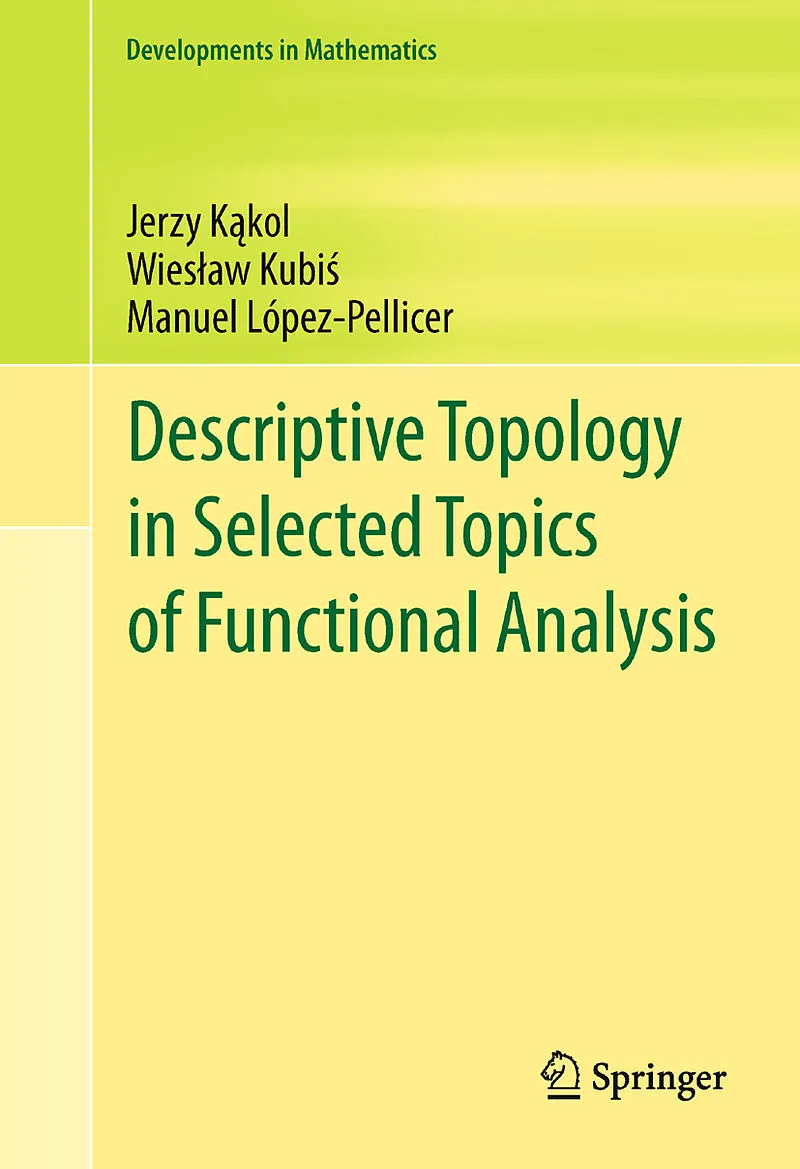 Jerzy K kol is Full Professor of Mathematics at the Adam Mickiewicz University of Poznä (Poland). His research is strongly connected with functional analysis, infinite-dimensional and descriptive topology, and applications of topological methods in functional analysis. He published over 180 research papers, mainly in functional analysis and (descriptive) topology. In 1989/91 he was a scholarship holder of the Alexander von Humboldt foundation, which he carried out at the Universities of Munich and Saarbrucken. He conducted scientific research as a visiting professor at several universities in US (New York, Gainesville and Grand Forks, among others) and in Spain (Valencia, Murcia). Since 2005 he has been a member of the Spanish Royal Academy of Sciences. Wieslaw Kubi is Full Professor of Mathematics, currently a Researcher in the Czech Academy of Sciences, Prague, Czechia, and also Professor at the Cardinal Stefan Wyszynski University in Warsaw, Poland. His research spans several areas of pure mathematics: set theory, category theory, topology, and functional analysis---aiming at developing generic mathematical structures. He has published over 60 research articles, and is a co-author of the first edition of the current monograph. Prof. Kubi is currently leading a prestigious five-year Excellence in Basic Research Grant Project EXPRO, awarded by the Czech Science Foundation. Manuel López-Pellicer was Full Professor of Mathematics at the Polytechnic University of Valencia (Spain) until 2015 and since then he is Professor Emeritus. His research is mainly connected with Functional Analysis, General Topology and applications of topological methods in functional analysis, with over 120 publications. He is a coauthor of the monographs "Metrizable barrelled spaces" (Longman 1995) and of the first edition of the current monograph "Descriptive Topology in Selected Topics of Functional Analysis" (Springer 2011). Since 1998 he is a member of the Royal Academy of Sciences of Spain, being since 2004 editor-in-chief of its Mathematical Journal, with acronym name RACSAM. Damian Sobota is a senior postdoc researcher at the Kurt Gödel Research Center for Mathematical Logic at the University of Vienna, where he has worked since finishing his PhD thesis at the Institute of Mathematics of the Polish Academy of Sciences in 2016. His research interests mostly concern applications of forcing and infinitary combinatorics to problems arising in Banach space theory and measure theory. He is an author or co-author of over 20 research papers.