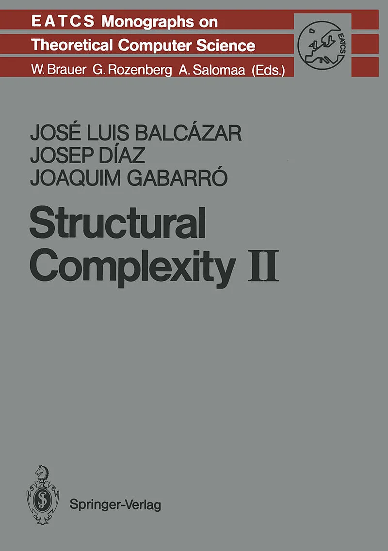 1 Vector Machines.- 1.1 Introduction.- 1.2 Vector Machines: Definition and Basic Properties.- 1.3 Elementary Matrix Algebra on Vector Machines.- 1.4 Relation Between Vector Machines and Turing Machines.- 1.5 Exercises.- 1.6 Bibliographical Remarks.- 2 The Parallel Computation Thesis.- 2.1 Introduction.- 2.2 An Array Machine: the APM.- 2.3 A Multiprocessor Machine: the SIMDAG.- 2.4 A Tree Machine: the k-PRAM.- 2.5 Further Parallel Models.- 2.6 Exercises.- 2.7 Bibliographical Remarks.- 3 Alternation.- 3.1 Introduction.- 3.2 Alternating Turing Machines.- 3.3 Complexity Classes for Alternation.- 3.4 Computation Graphs of a Deterministic Turing Machine.- 3.5 Determinism Versus Nondeterminism for Linear Time.- 3.6 Exercises.- 3.7 Bibliographical Remarks.- 4 Uniform Circuit Complexity.- 4.1 Introduction.- 4.2 Uniform Circuits: Basic Definitions.- 4.3 Relationship with General-Purpose Parallel Computers.- 4.4 Other Uniformity Conditions.- 4.5 Alternating Machines and Uniformity.- 4.6 Robustness of NC and Conclusions.- 4.7 Exercises.- 4.8 Bibliographical Remarks.- 5 Isomorphism and NP-completeness.- 5.1 Introduction.- 5.2 Polynomial Time Isomorphisms.- 5.3 Polynomial Cylinders.- 5.4 Sparse Complete Sets.- 5.5 Exercises.- 5.6 Bibliographical Remarks.- 6 Bi-Immunity and Complexity Cores.- 6.1 Introduction.- 6.2 Bi-Immunity, Complexity Cores, and Splitting.- 6.3 Bi-Immune Sets and Polynomial Time m-Reductions.- 6.4 Complexity Cores and Polynomial Time m-Reductions.- 6.5 Levelability, Proper Cores, and Other Properties.- 6.6 Exercises.- 6.7 Bibliographical Remarks.- 7 Relativization.- 7.1 Introduction.- 7.2 Basic Results.- 7.3 Encoding Sets in NP Relativized.- 7.4 Relativizing Probabilistic Complexity Classes.- 7.5 Isolating the Crucial Parameters.- 7.6 Refining Nondeterminism.- 7.7Strong Separations.- 7.8 Further Results in Relativizations.- 7.9 Exercises.- 7.10 Bibliographical Remarks.- 8 Positive Relativizations.- 8.1 Introduction.- 8.2 A Positive Relativization of the $$P\mathop = \limits^? PSPACE$$ Problem.- 8.3 A Positive Relativization of the $$NP\mathop = \limits^? PSPACE$$ Problem.- 8.4 A Positive Relativization of the $$P\mathop = \limits^? NP$$ Problem.- 8.5 A Relativizing Principle.- 8.6 Exercises.- 8.7 Bibliographical Remarks.- 9 The Low and the High Hierarchies.- 9.1 Introduction.- 9.2 Definitions and Characterizations.- 9.3 Relationship with the Polynomial Time Hierarchy.- 9.4 Some Classes of Low Sets.- 9.5 Oracle-Restricted Positive Relativizations.- 9.6 Lowness Outside NP.- 9.7 Exercises.- 9.8 Bibliographical Remarks.- 10 Resource-Bounded Kolmogorov Complexity.- 10.1 Introduction.- 10.2 Unbounded Kolmogorov Complexity.- 10.3 Resource-Bounded Kolmogorov Complexity.- 10.4 Tally Sets, Printability, and Ranking.- 10.5 Kolmogorov Complexity of Characteristic Functions.- 10.6 Exercises.- 10.7 Bibliographical Remarks.- 11 Probability Classes and Proof-Systems.- 11.1 Introduction.- 11.2 Interactive Proof-Systems: Basic Definitions and Examples.- 11.3 Arthur Against Merlin Games.- 11.4 Probabilistic Complexity Classes and Proof-Systems.- 11.5 Equivalence of AM and IP.- 11.6 Exercises.- 11.7 Bibliographical Remarks.- Appendix: Complementation via Inductive Counting.- 1 Nondeterministic Space is Closed Under Complement.- 2 Bibliographical Remarks.- References.- Author Index.- Symbol Index.