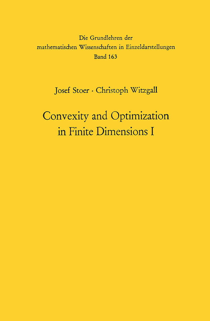 1 Inequality Systems.- 1.1. Linear Combinations of Inequalities.- 1.2. Fourier Elimination.- 1.3. Proof of the Kuhn-Fourier Theorem.- 1.4. Consequence Relations. The Farkas Lemma.- 1.5. Irreducibly Inconsistent Systems.- 1.6. Transposition Theorems.- 1.7. The Duality Theorem of Linear Programming.- 2 Convex Polyhedra.- 2.1. Means and Averages.- 2.2. Dimensions.- 2.3. Polyhedra and their Boundaries.- 2.4. Extreme and Exposed Sets.- 2.5. Primitive Faces. The Finite Basis Theorem.- 2.6. Subspaces. Orthogonality.- 2.7. Cones. Polarity.- 2.8. Polyhedral Cones.- 2.9. A Direct Proof of the Theorem of Weyl.- 2.10. Lineality Spaces.- 2.11. Homogenization.- 2.12. Decomposition and Separation of Polyhedra.- 2.13. Face Lattices of Polyhedral Cones.- 2.14. Polar and Dual Polyhedra.- 2.15. Gale Diagrams.- 3 Convex Sets.- 3.1. The Normed Linear Space Rn.- 3.2. Closure and Relative Interior of Convex Sets.- 3.3. Separation of Convex Sets.- 3.4. Supporting Planes and Cones.- 3.5. Boundedness and Polarity.- 3.6. Extremal Properties.- 3.7. Combinatorial Properties.- 3.8. Topological Properties.- 3.9. Fixed Point Theorems.- 3.10. Norms and Support Functions.- 4 Convex Functions.- 4.1. Convex Functions.- 4.2. Epigraphs.- 4.3. Directorial Derivatives.- 4.4. Differentiable Convex Functions.- 4.5. A Regularity Condition.- 4.6. Conjugate Functions.- 4.7. Strongly Closed Convex Functions.- 4.8. Examples of Conjugate Functions.- 4.9. Generalization of Convexity.- 4.10. Pseudolinear Functions.- 5 Duality Theorems.- 5.1. The Duality Theorem of Fenchel.- 5.2. Duality Gaps.- 5.3. Generalization of Fenchel's Duality Theorem.- 5.4. Proof of the Generalized Fenchel Theorem.- 5.5. Alternative Characterizations of Stability.- 5.6. Generation of Stable Functions.- 5.7. Rockafellar's Duality Theorem.-5.8. Duality Theorems of the Dennis-Dorn Type.- 5.9. Duality Theorems for Quadratic Programs.- 6 Saddle Point Theorems.- 6.1. The Minimax Theorem of v. Neumann.- 6.2. Saddle Points.- 6.3. Minimax Theorems for Compact Sets.- 6.4. Minimax Theorems for Noncompact Sets.- 6.5. Lagrange Multipliers.- 6.6. Kuhn-Tucker Theory for Differentiable Functions.- 6.7. Saddle Points of the Lagrangian.- 6.8. Duality Theorems and Lagrange Multipliers.- 6.9. Constrained Minimax Programs.- 6.10. Systems of Convex Inequalities.- Author and Subject Index.