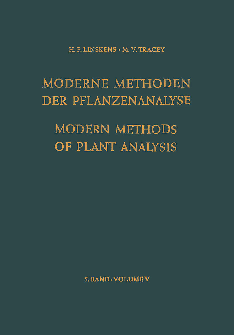 Contents.- Emission and Atomic Absorption Spectrochemical Methods..- A. Flame Emission Methods.- B. Arc Emission Analysis.- C. Spark Emission Methods.- D. Atomic Absorption Methods.- References.- Mass Spectrometric Methods..- A. Instrumentation.- B. The Sample.- C. Origin of Mass Spectra and their Interpretation.- D. Specific Applications.- Appendix I.- References.- Plant Spectra: Absorption and Action..- A. Instrumentation.- B. Light Scatter Phenomena.- C. Absorption Spectra.- D. Action Spectra.- E. Fluorescence Excitation Spectra.- References.- Gefriertrocknung..- A. Die biologischen Probleme der Gefriertrocknung.- B. Die Vakuum-Sublimation.- C. Anwendungen.- D. Verwandte Methoden.- Vapour Phase Chromatography..- A. Theoretical Approach.- B. Apparatus Requirements.- C. Techniques.- D. Applications.- E. Conclusion.- References.- Ion-Exchange Chromatography..- A. Ion-Exchange Materials.- B. Theory of Chromatographic Procedures.- C. Apparatus.- D. Experimental Procedures.- E. Some Applications of Ion-Exchange Chromatography.- F. Ion-Exclusion.- G. Mechanism of Adsorption of Solutes on Ion-Exchange Resins.- H. Applicability of Ion-Exchange Chromatography.- References.- Table 1. Chromatographie grade resins and celluloses.- Molecular Sieving other than Dialysis..- A. Ion-Exchange Materials as Ionic Sieves.- B. Molecular Sieving on Starch.- C. Dextran Gels as Molecular Sieves.- References.- Dünnschicht-Chromatographie..- A. Methode und Geräte.- B. Spezielle Arbeitstechniken.- C. Anwendungsbereich und Einsatzmöglichkeiten.- D. Anwendungsbeispiele.- Literatur.- Paper Chromatography on a Preparative Scale..- A. General.- B. Multisheet- and Cardboard-Chromatography.- C. Separation on Paper-Packs.- D. Column Chromatography.- E. Continous Paper Chromatography.- F.Accelerated Chromatography.- References.- Determination of Size, Shape and Homogeneity of Macromolecules in Solution..- A. Average Molecular Weights.- B. Osmotic Pressure.- C. Light Scattering.- D. Diffusion.- E. Ultracentrifugation.- F. Viscosity.- G. Particle Shape from Hydrodynamic Measurements.- Sectional References.- Optical Rotatory Dispersion. Its Application to Protein Conformation..- A. Mean Residue Rotation of Polypeptides and Proteins.- B. Optical Rotatory Dispersion Drude Equation.- C. Rotatory Properties of Synthetic Polypeptides.- D. Optical Rotatory Properties of Proteins.- E. Temperature Dependence of Optical Rotation.- F. Measurement of Optical Rotation.- G. Treatment of Data.- References.- Diffuse Röntgenkleinwinkelstreuung..- A. Theorie.- B. Experimentelle Methodik.- C. Anwendungsbeispiele.- Literatur.- Méthodes Calorimétriques pour l';Analyse des Végétaux..- I. Appareillage.- II. Thermogenèse de Germinations.- III. Gradients de Thermogénèse dans les Organes en Croissance.- IV. Thermogénèse des Cultures Bactériennes et Mycéliennes; Fermentations.- V. Chaleurs de Combustion d';Organes et de Produits Végétaux.- VI. Conclusion.- Références Bibliographiques.- Surface Factors Affecting the Penetration of Compounds into Plants..- A. Effect of Molecular Structure on Permeation.- B. Effect of Surface and Interfacial Factors on Potency of Treatments.- C. Surface and Interfacial Tension.- D. Wetting and Spreading.- References.- Tissue and Single Cell Cultures of Higher Plants as a Basic Experimental Method..- A. History of the Method.- B. Types of Cultures.- C. Tissue Culture Media.- D. Isolations of Organs, Tissues and Cells.- E. Transfer and Maintenance of Cultures.- F. Single CeU Cultures.- G. Growth Measurements.- H. Requirementsfor Growth of Callus Cultures.- J. Some Applications of Tissue and Cell Cultures.- K. Resume.- References.- Immunological Methods..- A. The General Principles of Immunological Methods.- B. Purification of Antigens, Immunization of Animals and Treatment of Antisera.- C. Serological Methods.- D. Antigen-Antibody Reactions in Sensitized Animals or Their Organs.- E. Quantitative Determinations of Antigens.- F. Measurements of the Amounts of Antibodies in Sera.- G. Methods for the Determination of Relationships between Antigens.- H. Immuno-Chemical Criteria of Purity of Antigens.- J. Applications.- Concluding Remarks.- References.- Polarography and Tensammetry..- A. Principles of Polarography.- B. The Practice of Polarography.- References.- Fallout Contamination in Plants..- A. Factors which Influence the Fallout Contamination of Plants.- B. Methods of Estimating Gross Fallout Contamination in Plant Material.- C. Methods of Estimating the Individual Radionuclides in Contaminated Plant Materials.- References.- Sachverzeichnis (Deutsch-Englisch).- Subject Index (English-German).- Table des Matières pour la Contribution: H. Prat, Méthodes Calorimétriques pour l';Analyse des Végétaux.
