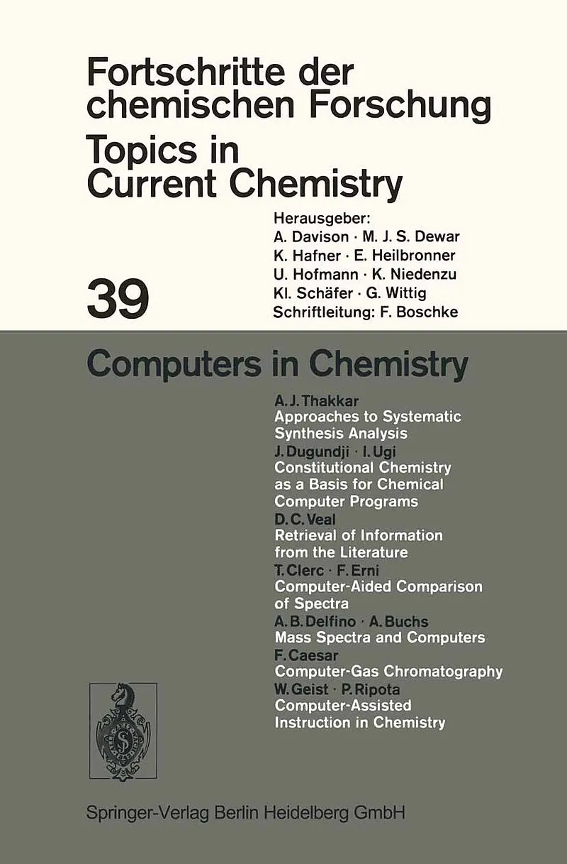 Inhalt The coming of the computer age to organic chemistry: Recent approaches to systematic synthesis analysis.- An algebraic model of constitutional chemistry as a basis for chemical computer programs.- Computer techniques for retrieval of information from th...