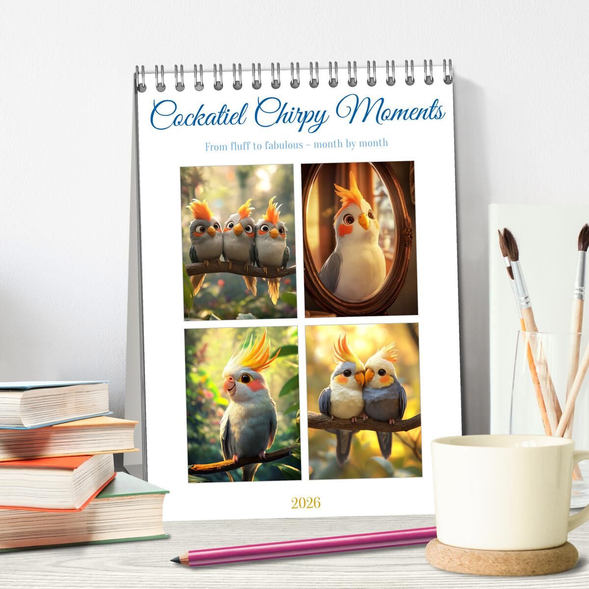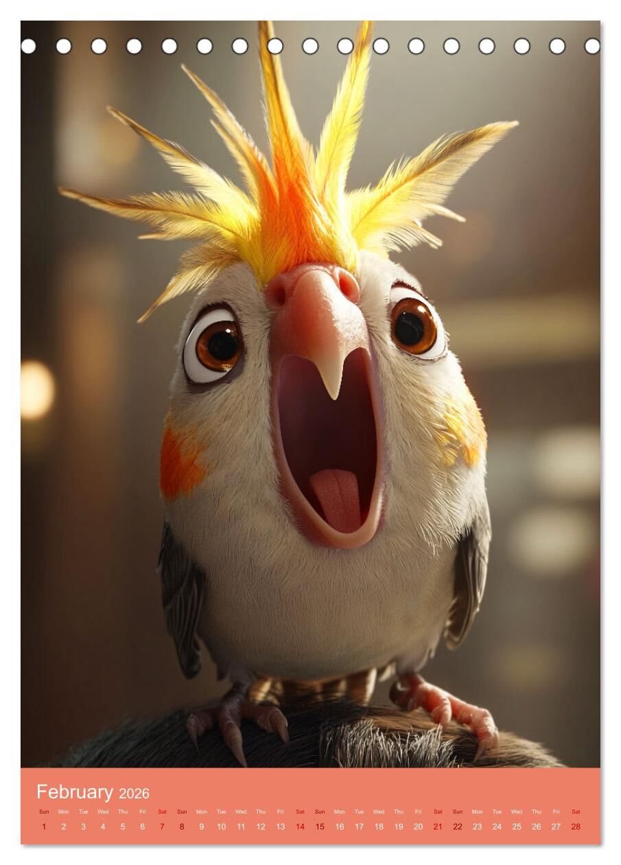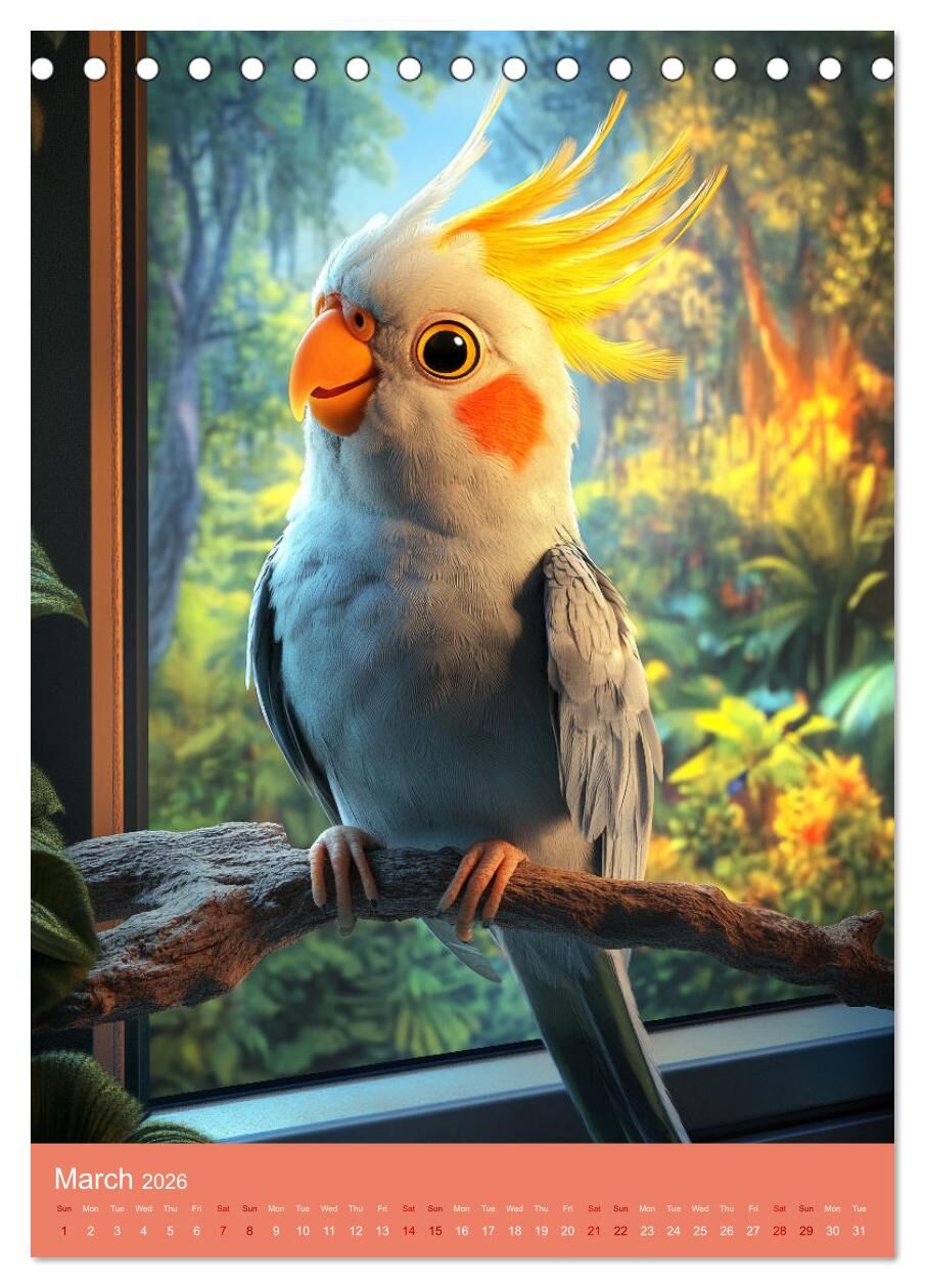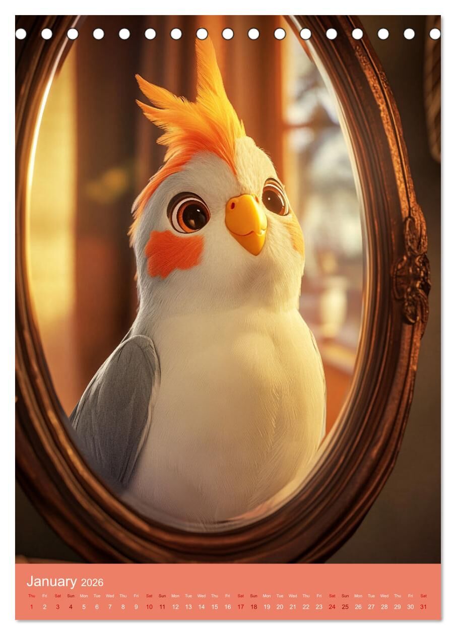 Cheeky, fluffy and simply irresistible - this calendar brings the lively world of cockatiels directly to your wall! Using state-of-the-art AI, the charming birds have been brought to life in a unique, detailed style. Each illustration perfectly captures the pl...