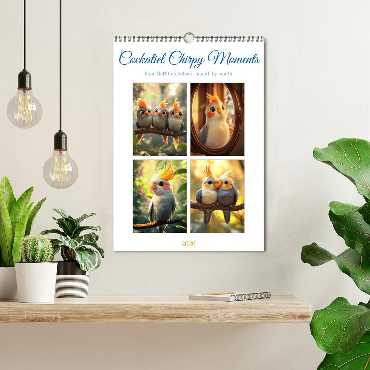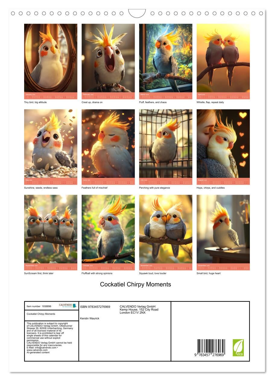 Cheeky, fluffy and simply irresistible - this calendar brings the lively world of cockatiels directly to your wall! Using state-of-the-art AI, the charming birds have been brought to life in a unique, detailed style. Each illustration perfectly captures the pl...