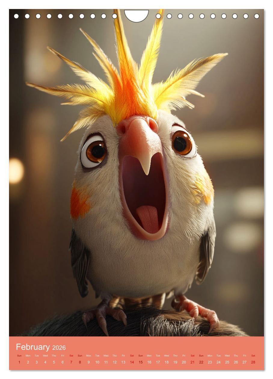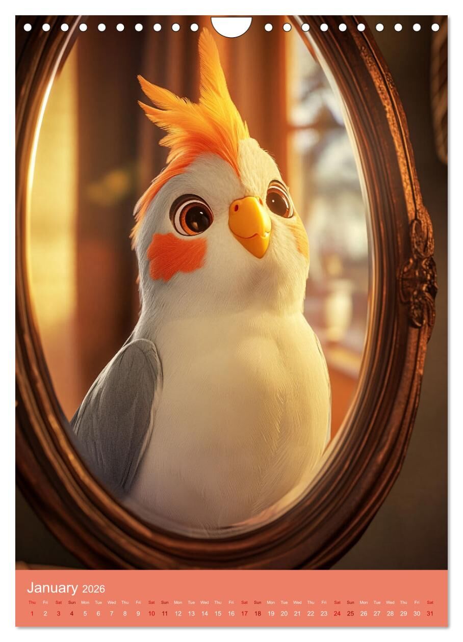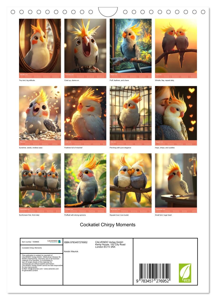Cheeky, fluffy and simply irresistible - this calendar brings the lively world of cockatiels directly to your wall! Using state-of-the-art AI, the charming birds have been brought to life in a unique, detailed style. Each illustration perfectly captures the pl...