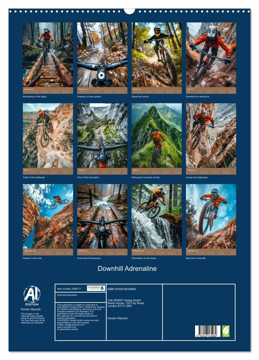 Immerse yourself in the breathtaking world of downhill mountain biking with our exclusive calendar! Our unique images, generated by AI and designed similar to GoPro footage, perfectly capture the intense action and adrenaline rushes of the downhill and freerid...