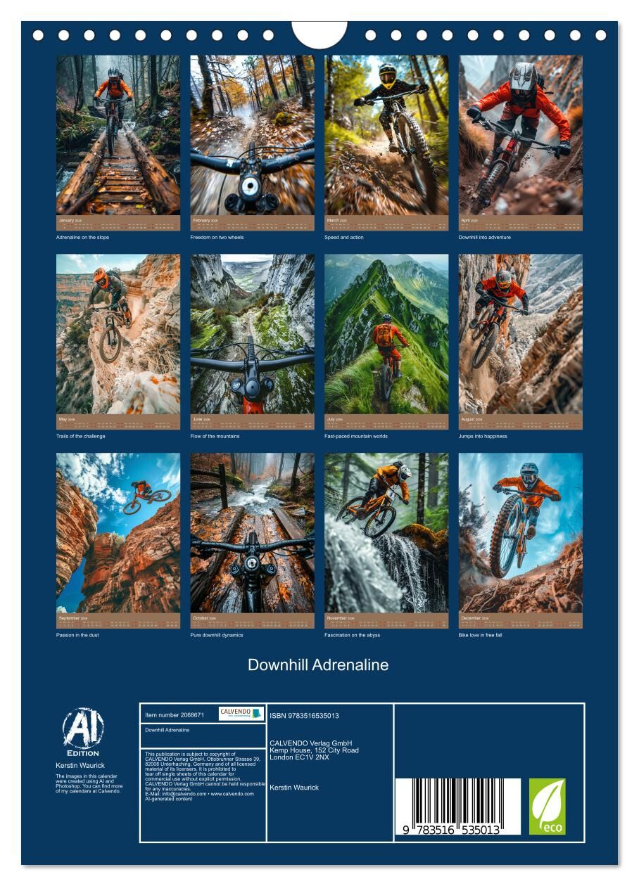 Immerse yourself in the breathtaking world of downhill mountain biking with our exclusive calendar! Our unique images, generated by AI and designed similar to GoPro footage, perfectly capture the intense action and adrenaline rushes of the downhill and freerid...