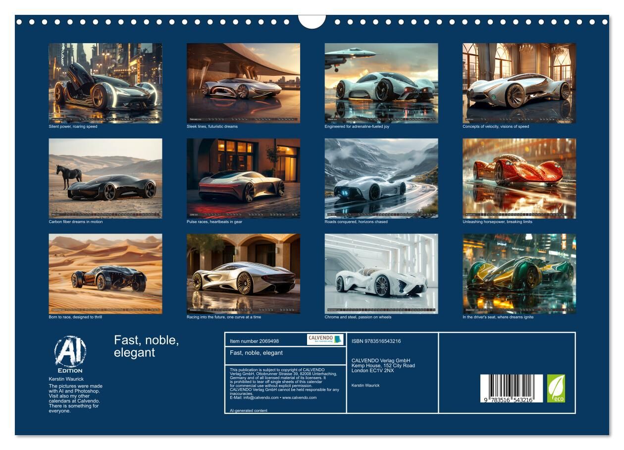 This calendar presents a fascinating fusion of elegant cars in organic shapes, combined with beautiful women and confident men. Each month becomes a unique work of art to dream, combining the fascination for modern automotive technology and the elegance of fem...