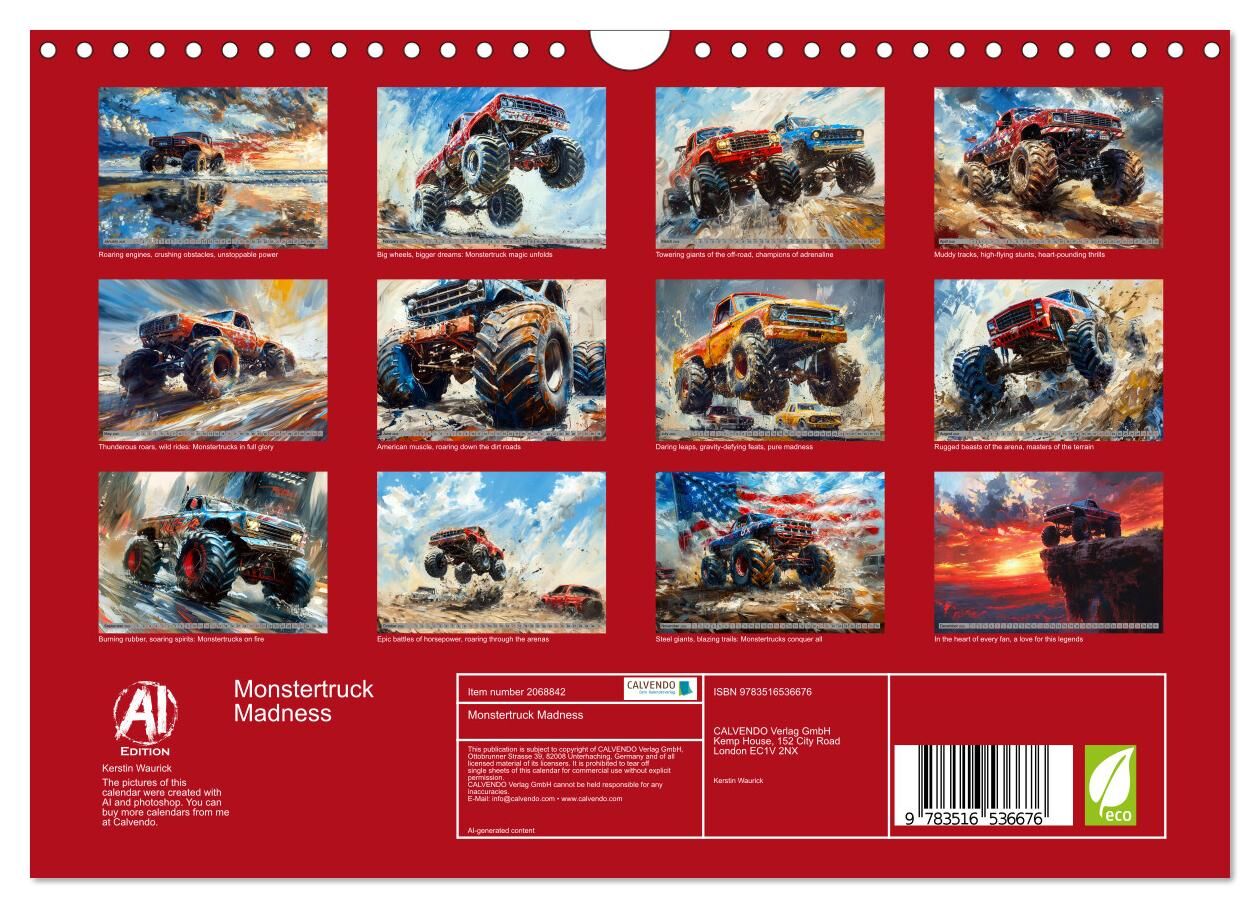Rev up your excitement with the Monstertruck Madness: Powered by AI calendar. Experience the adrenaline rush of 12 jaw-dropping images, each showcasing the monstrous power and thrilling stunts of these titans of the track. With the magic of AI technology, ever...