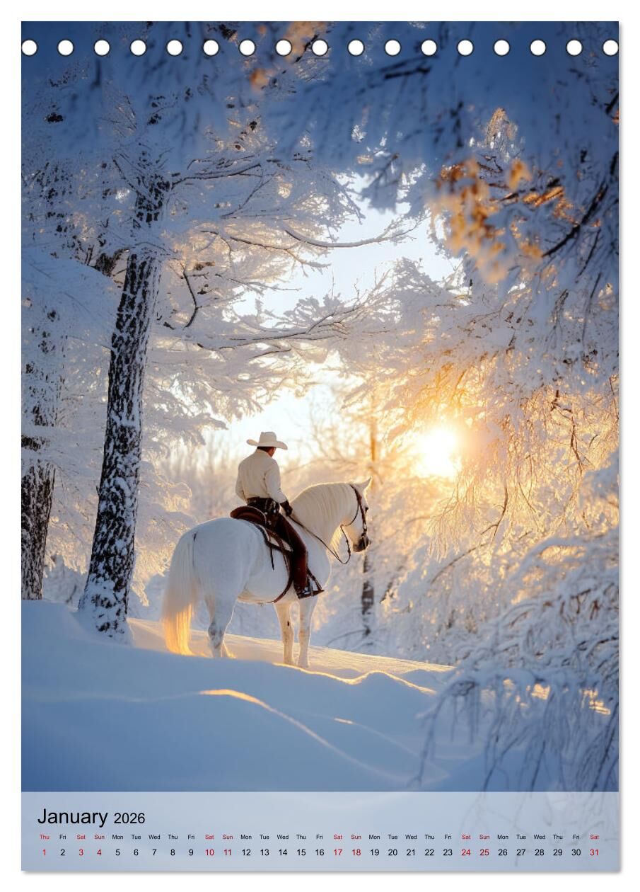 This calendar shows the true art of western riding, captured in stunning, AI-generated images. Each month conveys the deep understanding and connection between rider and horse - the harmonious interplay of man and animal in harmony with nature. Modern AI techn...