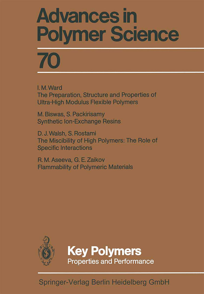 Editorial.- The preparation, structure and properties of ultra-high modulus flexible polymers.- Synthetic ion-exchange resins.- The miscibility of high polymers: The role of specific interactions.- Flammability of polymeric materials.