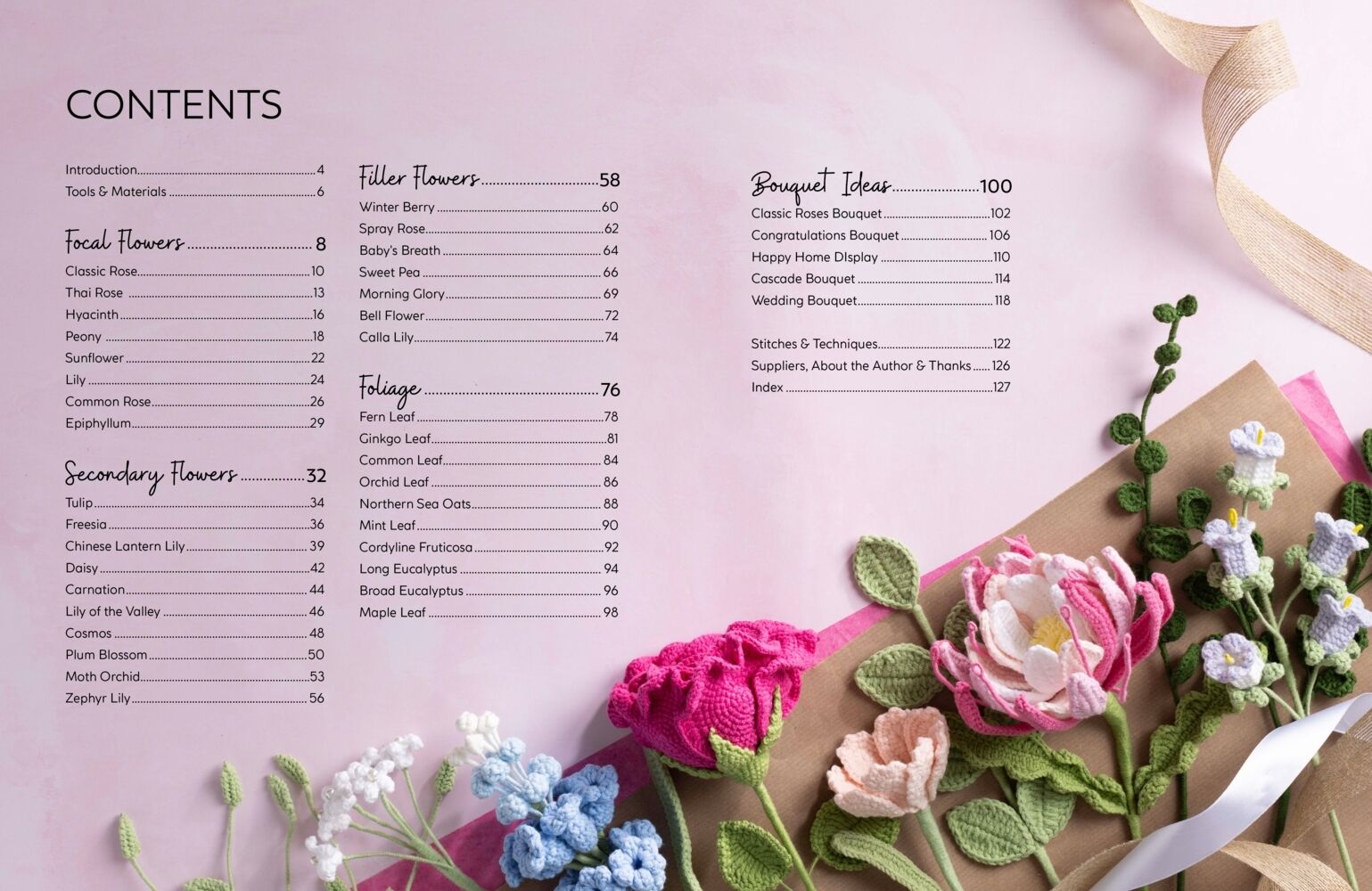 Create incredible, lifelike floral bouquets with this collection of crochet patterns for flowers and foliage. Includes crochet patterns for 35 different flowers, five different kinds of foliage and five different bouquet idea suggestions which can be used to create beautiful floral bouquets to display at home or gift to friends and family.