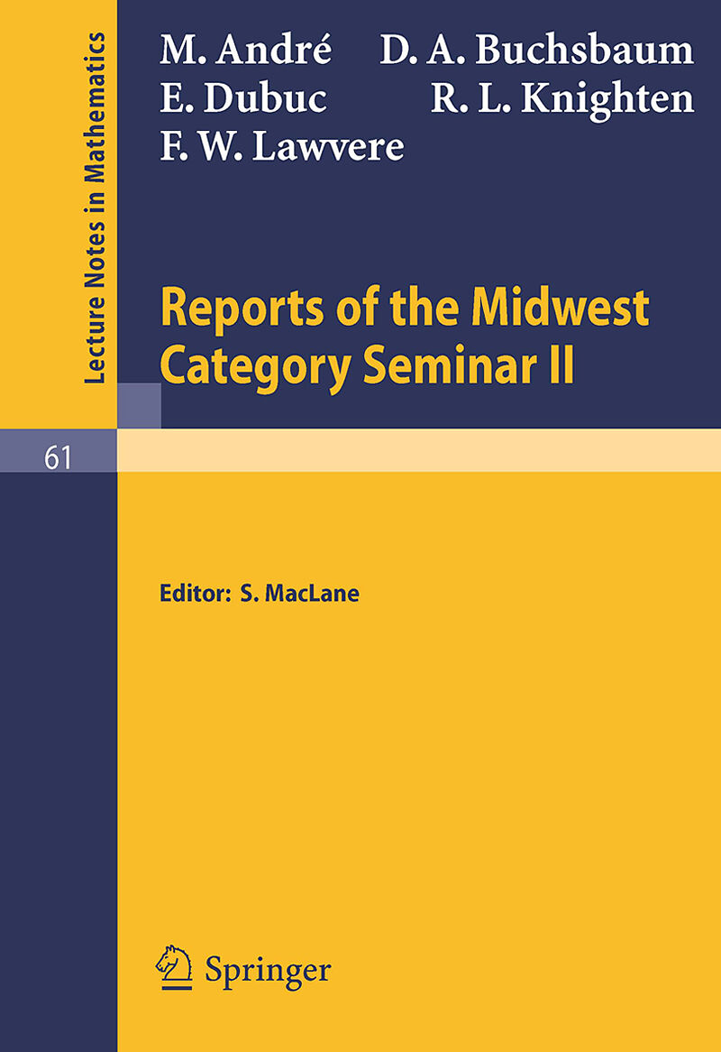 Inhalt On the vanishing of the second cohomology group of a commutative algebra.- Homology and universality relative to a functor.- Some algebraic problems in the context of functorial semantics of algebraic theories.- An application of categories of fractions...