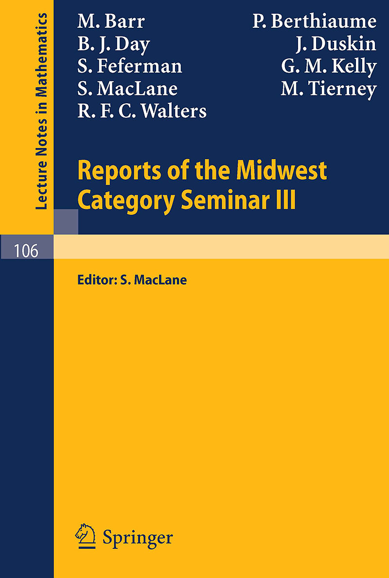 Inhalt What is the center?.- The functor evaluation.- An alternative approach to universal algebra.- Variations on Beck's tripleability criterion.- Autonomous categories with models.- Adjunction for enriched categories.- Enriched functor categories.- One unive...