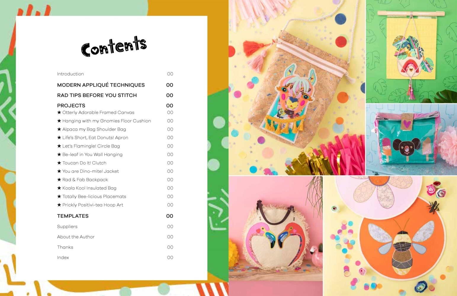 As well as the main techniques section there are 12 exciting projects to choose from. Mandy is known for her fun and quirky designs: a dachshund in a donut, an otter on an inflatable and a flamingo who likes to mingle all feature in this fun pattern collection which includes wall art, embellishments on clothing, cushions, quilts and an apron.