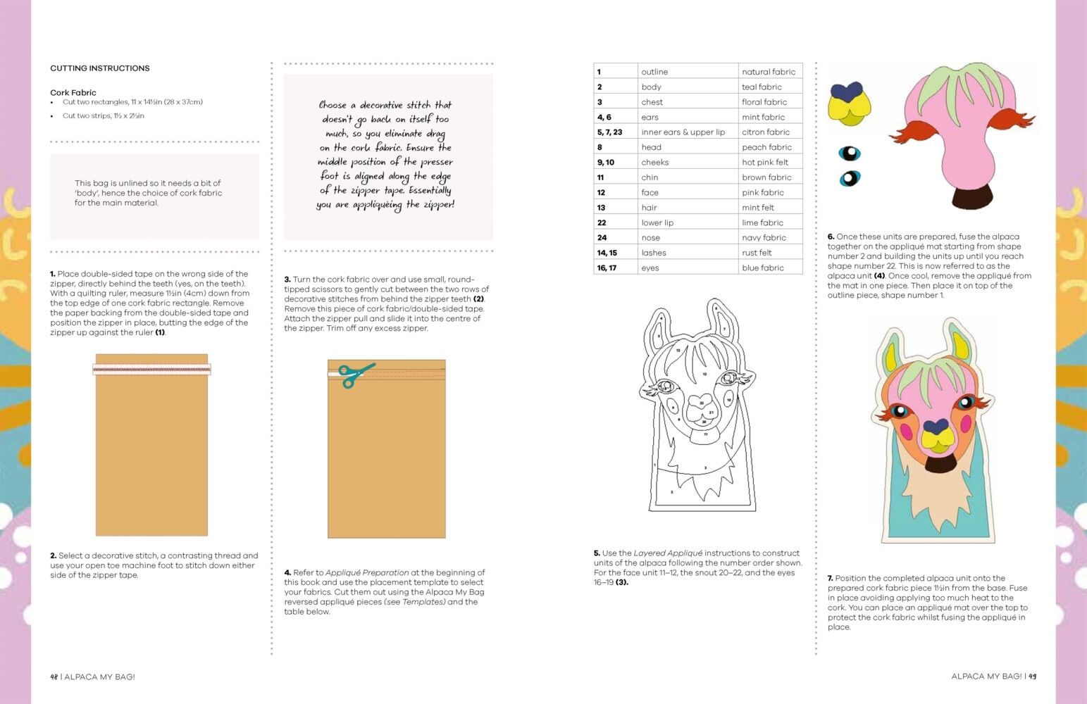 Mandy uses fusible applique to bring her designs to life and she explains this technique with step-by-step instructions and illustrations at the beginning of the book along with specific advice about getting the most from your sewing machine and using unusual fabrics - she loves to incorporate cork, vinyl and other eye catching fabrics into her designs.