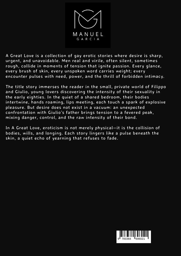 A Great Love is a collection of gay erotic stories where desire is sharp, urgent, and unavoidable. Men real and virile, often silent, sometimes rough, collide in moments of tension that ignite passion. Every glance, every brush of skin, every unspoken word car...A Great Love is a collection of gay erotic stories where desire is sharp, urgent, and unavoidable. Men real and virile, often silent, sometimes rough, collide in moments of tension that ignite passion. Every glance, every brush of skin, every unspoken word carries weight; every encounter pulses with need, power, and the thrill of forbidden intimacy. The title story immerses the reader in the small, private world of Filippo and Giulio, young lovers discovering the intensity of their sexuality in the early eighties. In the quiet of a shared bedroom, their bodies intertwine, hands roaming, lips meeting, each touch a spark of explosive pleasure. But desire does not exist in a vacuum: an unexpected confrontation with Giulio's father brings tension to a fevered peak, mixing danger, control, and the raw intensity of their bond. In A Great Love, eroticism is not merely physicalit is the collision of bodies, wills, and longing. Each story lingers like a pulse beneath the skin, a quiet echo of yearning that refuses to fade.