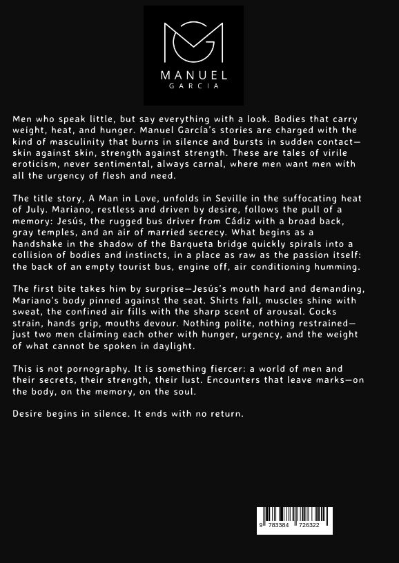 Men who speak little, but say everything with a look. Bodies that carry weight, heat, and hunger. Manuel García's stories are charged with the kind of masculinity that burns in silence and bursts in sudden contactskin against skin, strength against strength. T...Men who speak little, but say everything with a look. Bodies that carry weight, heat, and hunger. Manuel García's stories are charged with the kind of masculinity that burns in silence and bursts in sudden contactskin against skin, strength against strength. These are tales of virile eroticism, never sentimental, always carnal, where men want men with all the urgency of flesh and need. The title story, A Man in Love, unfolds in Seville in the suffocating heat of July. Mariano, restless and driven by desire, follows the pull of a memory: Jesús, the rugged bus driver from Cádiz with a broad back, gray temples, and an air of married secrecy. What begins as a handshake in the shadow of the Barqueta bridge quickly spirals into a collision of bodies and instincts, in a place as raw as the passion itself: the back of an empty tourist bus, engine off, air conditioning humming. The first bite takes him by surpriseJesús's mouth hard and demanding, Mariano's body pinned against the seat. Shirts fall, muscles shine with sweat, the confined air fills with the sharp scent of arousal. Cocks strain, hands grip, mouths devour. Nothing polite, nothing restrainedjust two men claiming each other with hunger, urgency, and the weight of what cannot be spoken in daylight. This is not pornography. It is something fiercer: a world of men and their secrets, their strength, their lust. Encounters that leave markson the body, on the memory, on the soul. Desire begins in silence. It ends with no return.