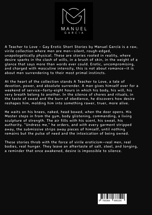 A Teacher to Love Gay Erotic Short Stories by Manuel García is a raw, virile collection where men are mensilent, rough-edged, unapologetically physical. These are stories rooted in reality, where desire sparks in the clash of wills, in a brush of skin, in the ...A Teacher to Love Gay Erotic Short Stories by Manuel García is a raw, virile collection where men are mensilent, rough-edged, unapologetically physical. These are stories rooted in reality, where desire sparks in the clash of wills, in a brush of skin, in the weight of a glance that says more than words ever could. Erotic, uncompromising, and charged with masculine intensity, this is not about romanceit is about men surrendering to their most primal instincts. At the heart of the collection stands A Teacher to Love, a tale of devotion, power, and absolute surrender. A man gives himself over for a weekend of serviceforty-eight hours in which his body, his will, his very breath belong to another. In the silence of chores and rituals, in the taste of sweat and the burn of obedience, he discovers how desire reshapes him, molding him into something rawer, truer, more alive. He waits on his knees, naked, head bowed, when the door opens. His Master steps in from the gym, body glistening, commanding, a living sculpture of strength. The air fills with his scent, his sweat, his authority. Undress me, he orders, and with every garment stripped away, the submissive strips away pieces of himself, until nothing remains but the pulse of need and the intoxication of being owned. These stories throb with the force of virile eroticismreal men, real bodies, real hunger. They leave an aftertaste of salt, steel, and longing, a reminder that once awakened, desire is impossible to silence.