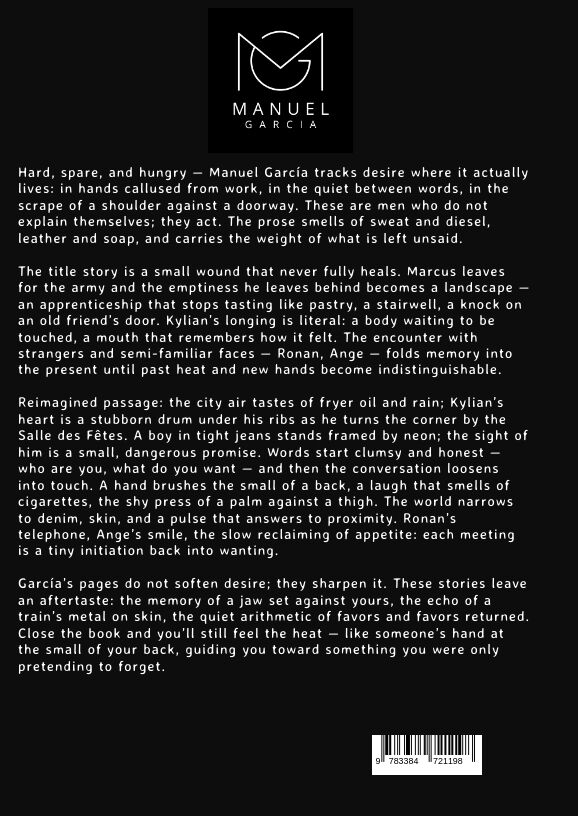 Hard, spare, and hungry Manuel García tracks desire where it actually lives: in hands callused from work, in the quiet between words, in the scrape of a shoulder against a doorway. These are men who do not explain themselves; they act. The prose smells of swea...Hard, spare, and hungry Manuel García tracks desire where it actually lives: in hands callused from work, in the quiet between words, in the scrape of a shoulder against a doorway. These are men who do not explain themselves; they act. The prose smells of sweat and diesel, leather and soap, and carries the weight of what is left unsaid. The title story is a small wound that never fully heals. Marcus leaves for the army and the emptiness he leaves behind becomes a landscape an apprenticeship that stops tasting like pastry, a stairwell, a knock on an old friend's door. Kylian's longing is literal: a body waiting to be touched, a mouth that remembers how it felt. The encounter with strangers and semi-familiar faces Ronan, Ange folds memory into the present until past heat and new hands become indistinguishable. Reimagined passage: the city air tastes of fryer oil and rain; Kylian's heart is a stubborn drum under his ribs as he turns the corner by the Salle des Fêtes. A boy in tight jeans stands framed by neon; the sight of him is a small, dangerous promise. Words start clumsy and honest who are you, what do you want and then the conversation loosens into touch. A hand brushes the small of a back, a laugh that smells of cigarettes, the shy press of a palm against a thigh. The world narrows to denim, skin, and a pulse that answers to proximity. Ronan's telephone, Ange's smile, the slow reclaiming of appetite: each meeting is a tiny initiation back into wanting. García's pages do not soften desire; they sharpen it. These stories leave an aftertaste: the memory of a jaw set against yours, the echo of a train's metal on skin, the quiet arithmetic of favors and favors returned. Close the book and you'll still feel the heat like someone's hand at the small of your back, guiding you toward something you were only pretending to forget.