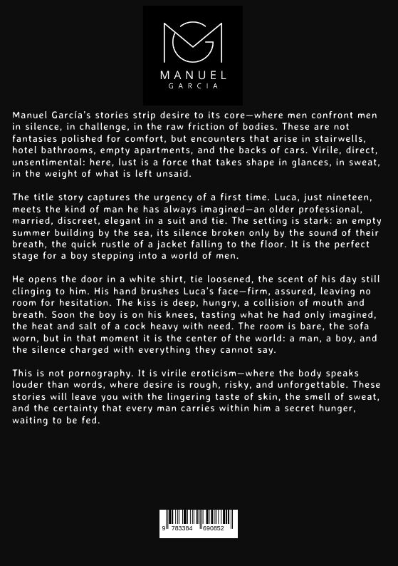 Manuel García's stories strip desire to its corewhere men confront men in silence, in challenge, in the raw friction of bodies. These are not fantasies polished for comfort, but encounters that arise in stairwells, hotel bathrooms, empty apartments, and the ba...Manuel García's stories strip desire to its corewhere men confront men in silence, in challenge, in the raw friction of bodies. These are not fantasies polished for comfort, but encounters that arise in stairwells, hotel bathrooms, empty apartments, and the backs of cars. Virile, direct, unsentimental: here, lust is a force that takes shape in glances, in sweat, in the weight of what is left unsaid. The title story captures the urgency of a first time. Luca, just nineteen, meets the kind of man he has always imaginedan older professional, married, discreet, elegant in a suit and tie. The setting is stark: an empty summer building by the sea, its silence broken only by the sound of their breath, the quick rustle of a jacket falling to the floor. It is the perfect stage for a boy stepping into a world of men. He opens the door in a white shirt, tie loosened, the scent of his day still clinging to him. His hand brushes Luca's facefirm, assured, leaving no room for hesitation. The kiss is deep, hungry, a collision of mouth and breath. Soon the boy is on his knees, tasting what he had only imagined, the heat and salt of a cock heavy with need. The room is bare, the sofa worn, but in that moment it is the center of the world: a man, a boy, and the silence charged with everything they cannot say. This is not pornography. It is virile eroticismwhere the body speaks louder than words, where desire is rough, risky, and unforgettable. These stories will leave you with the lingering taste of skin, the smell of sweat, and the certainty that every man carries within him a secret hunger, waiting to be fed.