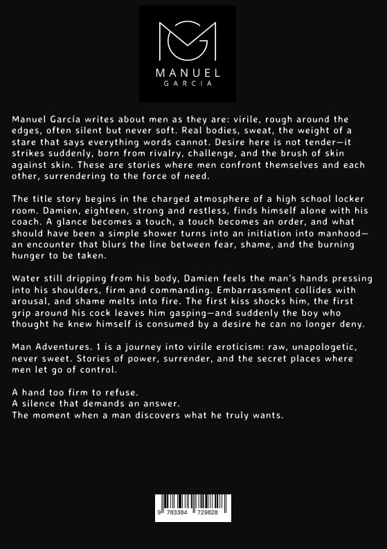 Manuel García writes about men as they are: virile, rough around the edges, often silent but never soft. Real bodies, sweat, the weight of a stare that says everything words cannot. Desire here is not tenderit strikes suddenly, born from rivalry, challenge, an...Manuel García writes about men as they are: virile, rough around the edges, often silent but never soft. Real bodies, sweat, the weight of a stare that says everything words cannot. Desire here is not tenderit strikes suddenly, born from rivalry, challenge, and the brush of skin against skin. These are stories where men confront themselves and each other, surrendering to the force of need. The title story begins in the charged atmosphere of a high school locker room. Damien, eighteen, strong and restless, finds himself alone with his coach. A glance becomes a touch, a touch becomes an order, and what should have been a simple shower turns into an initiation into manhoodan encounter that blurs the line between fear, shame, and the burning hunger to be taken. Water still dripping from his body, Damien feels the man's hands pressing into his shoulders, firm and commanding. Embarrassment collides with arousal, and shame melts into fire. The first kiss shocks him, the first grip around his cock leaves him gaspingand suddenly the boy who thought he knew himself is consumed by a desire he can no longer deny. Man Adventures. 1 is a journey into virile eroticism: raw, unapologetic, never sweet. Stories of power, surrender, and the secret places where men let go of control. A hand too firm to refuse. A silence that demands an answer. The moment when a man discovers what he truly wants.