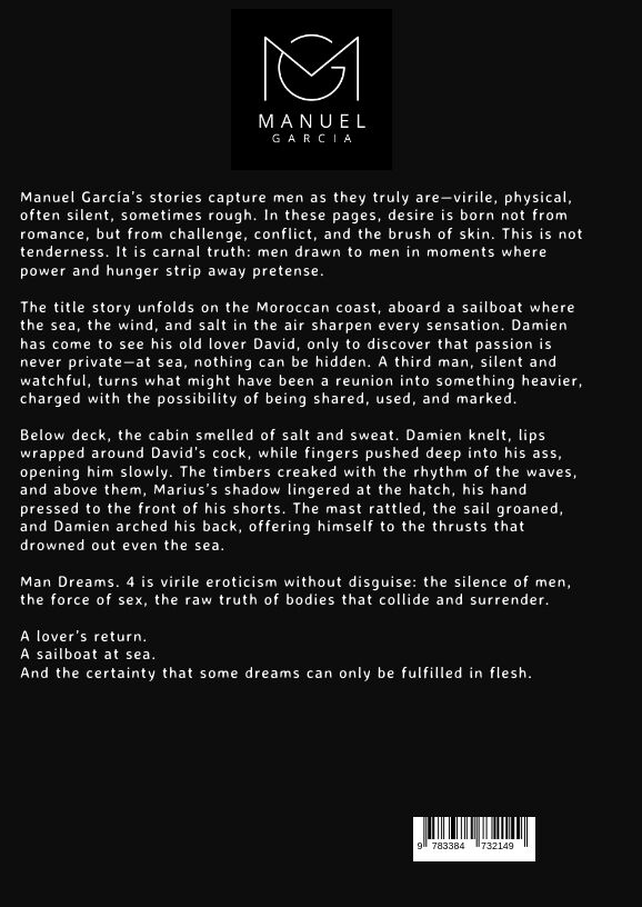 Manuel García's stories capture men as they truly arevirile, physical, often silent, sometimes rough. In these pages, desire is born not from romance, but from challenge, conflict, and the brush of skin. This is not tenderness. It is carnal truth: men drawn to...Manuel García's stories capture men as they truly arevirile, physical, often silent, sometimes rough. In these pages, desire is born not from romance, but from challenge, conflict, and the brush of skin. This is not tenderness. It is carnal truth: men drawn to men in moments where power and hunger strip away pretense. The title story unfolds on the Moroccan coast, aboard a sailboat where the sea, the wind, and salt in the air sharpen every sensation. Damien has come to see his old lover David, only to discover that passion is never privateat sea, nothing can be hidden. A third man, silent and watchful, turns what might have been a reunion into something heavier, charged with the possibility of being shared, used, and marked. Below deck, the cabin smelled of salt and sweat. Damien knelt, lips wrapped around David's cock, while fingers pushed deep into his ass, opening him slowly. The timbers creaked with the rhythm of the waves, and above them, Marius's shadow lingered at the hatch, his hand pressed to the front of his shorts. The mast rattled, the sail groaned, and Damien arched his back, offering himself to the thrusts that drowned out even the sea. Man Dreams. 4 is virile eroticism without disguise: the silence of men, the force of sex, the raw truth of bodies that collide and surrender. A lover's return. A sailboat at sea. And the certainty that some dreams can only be fulfilled in flesh.