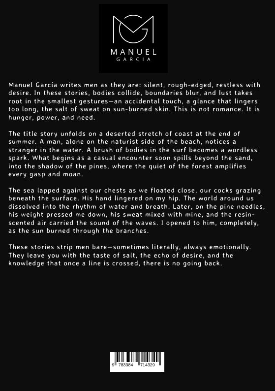 Manuel García writes men as they are: silent, rough-edged, restless with desire. In these stories, bodies collide, boundaries blur, and lust takes root in the smallest gesturesan accidental touch, a glance that lingers too long, the salt of sweat on sun-burned...Manuel García writes men as they are: silent, rough-edged, restless with desire. In these stories, bodies collide, boundaries blur, and lust takes root in the smallest gesturesan accidental touch, a glance that lingers too long, the salt of sweat on sun-burned skin. This is not romance. It is hunger, power, and need. The title story unfolds on a deserted stretch of coast at the end of summer. A man, alone on the naturist side of the beach, notices a stranger in the water. A brush of bodies in the surf becomes a wordless spark. What begins as a casual encounter soon spills beyond the sand, into the shadow of the pines, where the quiet of the forest amplifies every gasp and moan. The sea lapped against our chests as we floated close, our cocks grazing beneath the surface. His hand lingered on my hip. The world around us dissolved into the rhythm of water and breath. Later, on the pine needles, his weight pressed me down, his sweat mixed with mine, and the resin-scented air carried the sound of the waves. I opened to him, completely, as the sun burned through the branches. These stories strip men baresometimes literally, always emotionally. They leave you with the taste of salt, the echo of desire, and the knowledge that once a line is crossed, there is no going back.