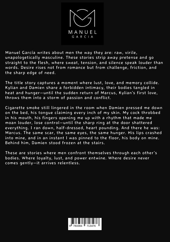 Manuel García writes about men the way they are: raw, virile, unapologetically masculine. These stories strip away pretense and go straight to the flesh, where sweat, tension, and silence speak louder than words. Desire rises not from romance but from challeng...Manuel García writes about men the way they are: raw, virile, unapologetically masculine. These stories strip away pretense and go straight to the flesh, where sweat, tension, and silence speak louder than words. Desire rises not from romance but from challenge, friction, and the sharp edge of need. The title story captures a moment where lust, love, and memory collide. Kylian and Damien share a forbidden intimacy, their bodies tangled in heat and hungeruntil the sudden return of Marcus, Kylian's first love, throws them into a storm of passion and conflict. Cigarette smoke still lingered in the room when Damien pressed me down on the bed, his tongue claiming every inch of my skin. My cock throbbed in his mouth, his fingers opening me up with a rhythm that made me moan louder, lose controluntil the sharp ring at the door shattered everything. I ran down, half-dressed, heart pounding. And there he was: Marcus. The same scar, the same eyes, the same hunger. His lips crashed into mine, and in an instant I was pinned to the floor, his body on mine. Behind him, Damien stood frozen at the stairs. These are stories where men confront themselves through each other's bodies. Where loyalty, lust, and power entwine. Where desire never comes gentlyit arrives relentless.