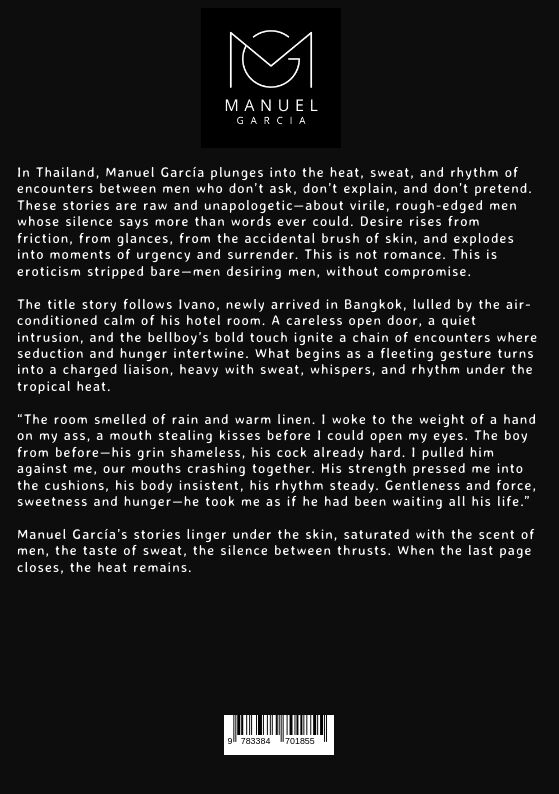 In Thailand, Manuel García plunges into the heat, sweat, and rhythm of encounters between men who don't ask, don't explain, and don't pretend. These stories are raw and unapologeticabout virile, rough-edged men whose silence says more than words ever could. De...In Thailand, Manuel García plunges into the heat, sweat, and rhythm of encounters between men who don't ask, don't explain, and don't pretend. These stories are raw and unapologeticabout virile, rough-edged men whose silence says more than words ever could. Desire rises from friction, from glances, from the accidental brush of skin, and explodes into moments of urgency and surrender. This is not romance. This is eroticism stripped baremen desiring men, without compromise. The title story follows Ivano, newly arrived in Bangkok, lulled by the air-conditioned calm of his hotel room. A careless open door, a quiet intrusion, and the bellboy's bold touch ignite a chain of encounters where seduction and hunger intertwine. What begins as a fleeting gesture turns into a charged liaison, heavy with sweat, whispers, and rhythm under the tropical heat. The room smelled of rain and warm linen. I woke to the weight of a hand on my ass, a mouth stealing kisses before I could open my eyes. The boy from beforehis grin shameless, his cock already hard. I pulled him against me, our mouths crashing together. His strength pressed me into the cushions, his body insistent, his rhythm steady. Gentleness and force, sweetness and hungerhe took me as if he had been waiting all his life. Manuel García's stories linger under the skin, saturated with the scent of men, the taste of sweat, the silence between thrusts. When the last page closes, the heat remains.
