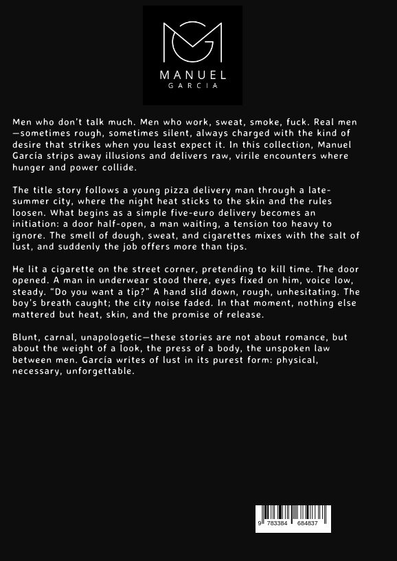 Men who don't talk much. Men who work, sweat, smoke, fuck. Real mensometimes rough, sometimes silent, always charged with the kind of desire that strikes when you least expect it. In this collection, Manuel García strips away illusions and delivers raw, virile...Men who don't talk much. Men who work, sweat, smoke, fuck. Real mensometimes rough, sometimes silent, always charged with the kind of desire that strikes when you least expect it. In this collection, Manuel García strips away illusions and delivers raw, virile encounters where hunger and power collide. The title story follows a young pizza delivery man through a late-summer city, where the night heat sticks to the skin and the rules loosen. What begins as a simple five-euro delivery becomes an initiation: a door half-open, a man waiting, a tension too heavy to ignore. The smell of dough, sweat, and cigarettes mixes with the salt of lust, and suddenly the job offers more than tips. He lit a cigarette on the street corner, pretending to kill time. The door opened. A man in underwear stood there, eyes fixed on him, voice low, steady. Do you want a tip? A hand slid down, rough, unhesitating. The boy's breath caught; the city noise faded. In that moment, nothing else mattered but heat, skin, and the promise of release. Blunt, carnal, unapologeticthese stories are not about romance, but about the weight of a look, the press of a body, the unspoken law between men. García writes of lust in its purest form: physical, necessary, unforgettable.
