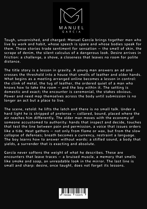 Tough, unvarnished, and charged: Manuel García brings together men who live by work and habit, whose speech is spare and whose bodies speak for them. These stories trade sentiment for sensation the smell of skin, the scrape of denim, the silent calculus of a d...