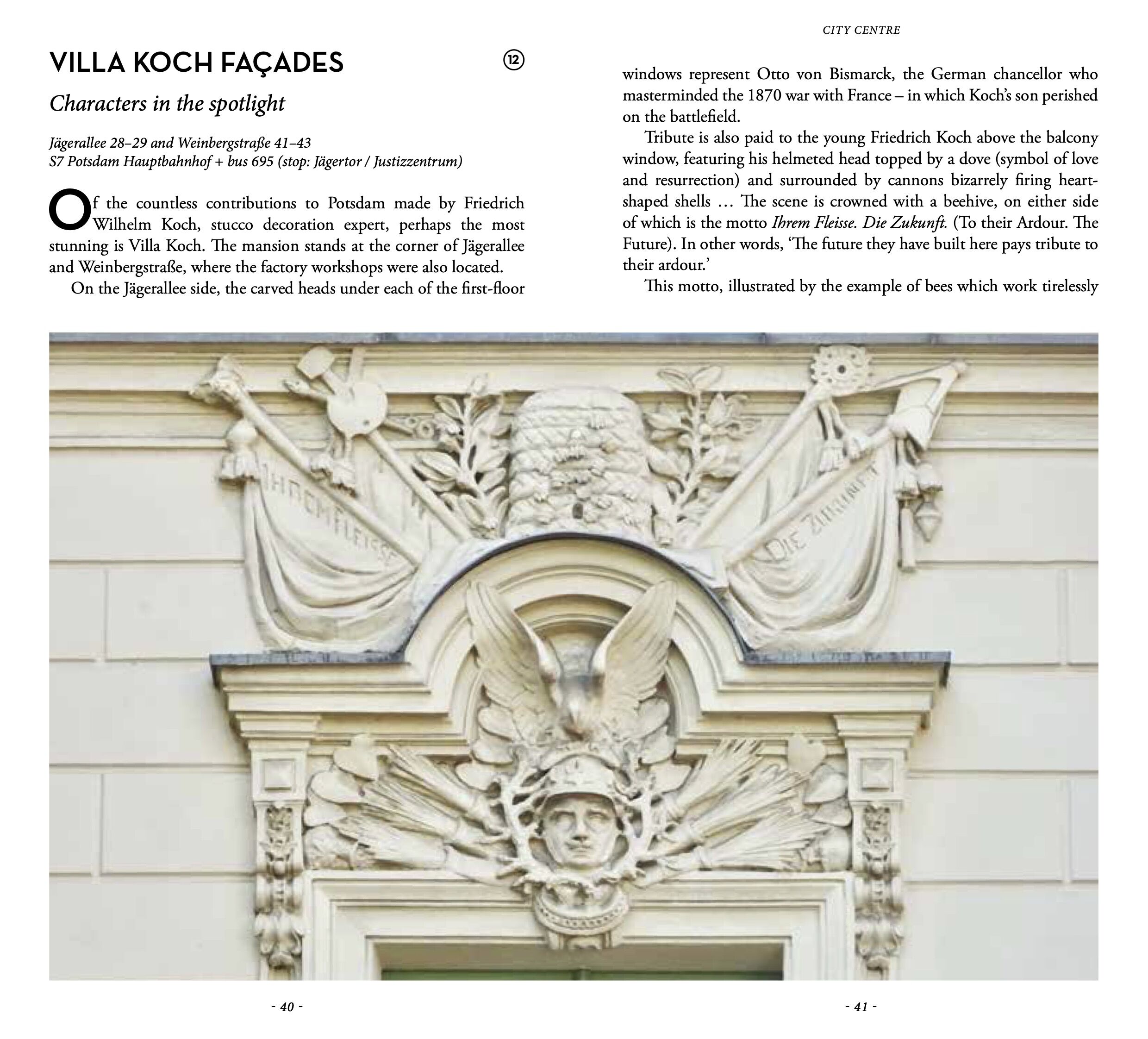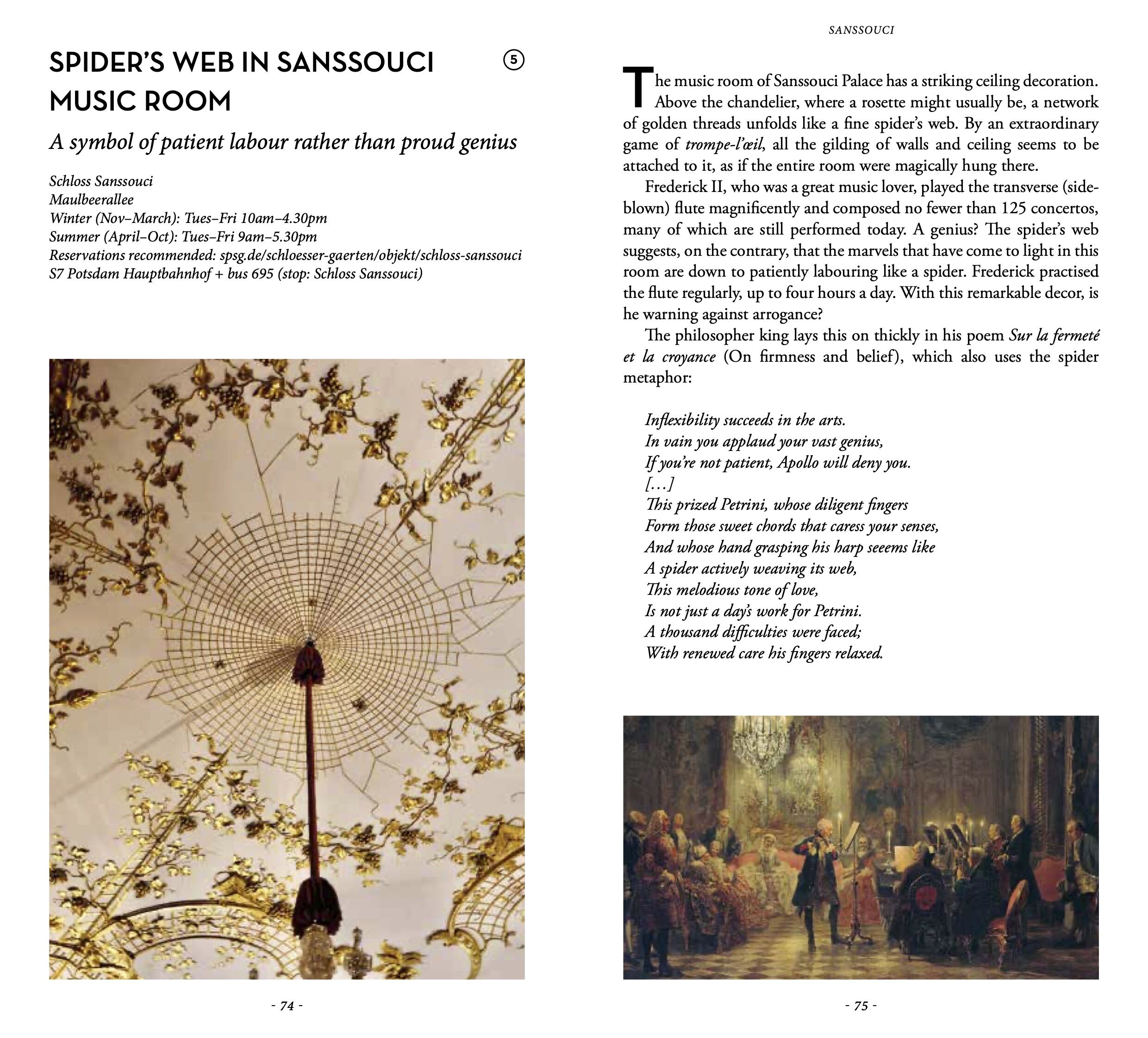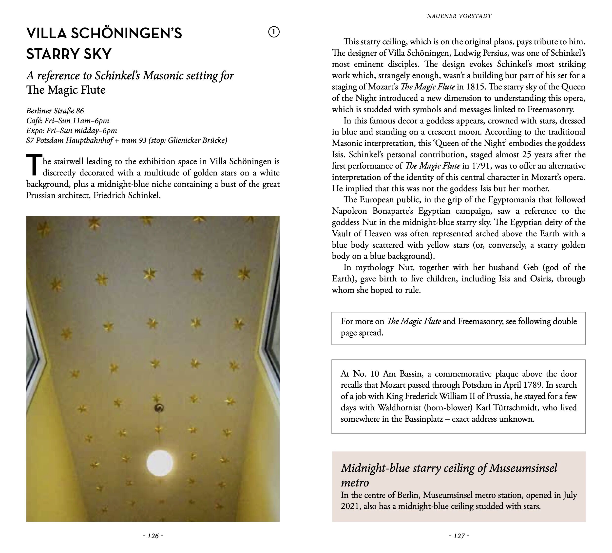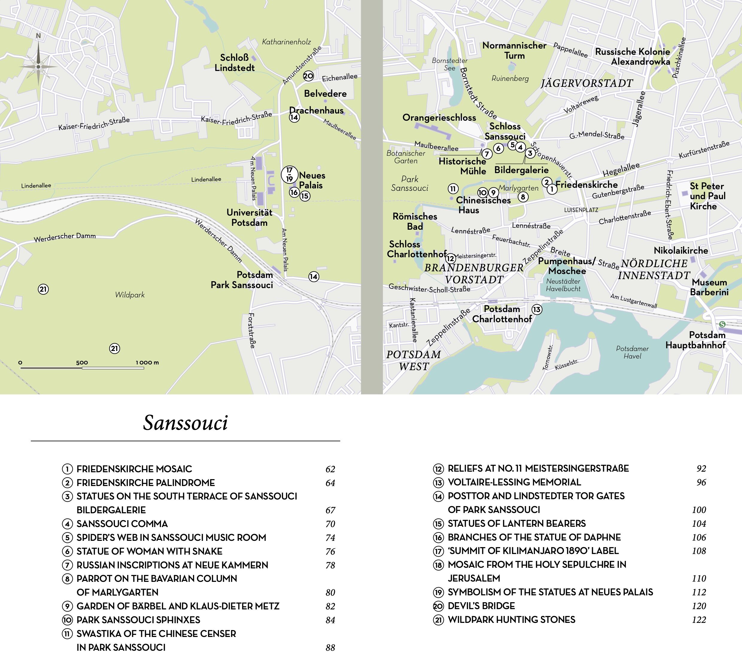 A piece of the summit of Kilimanjaro at the New Palace, a swastika in Sanssouci Park, a remnant of the 1893 Chicago World's Fair, the starry ceiling of a villa alluding to the Masonic setting of Mozart's opera The Magic Flute, a spectacular Expressionist tomb,...