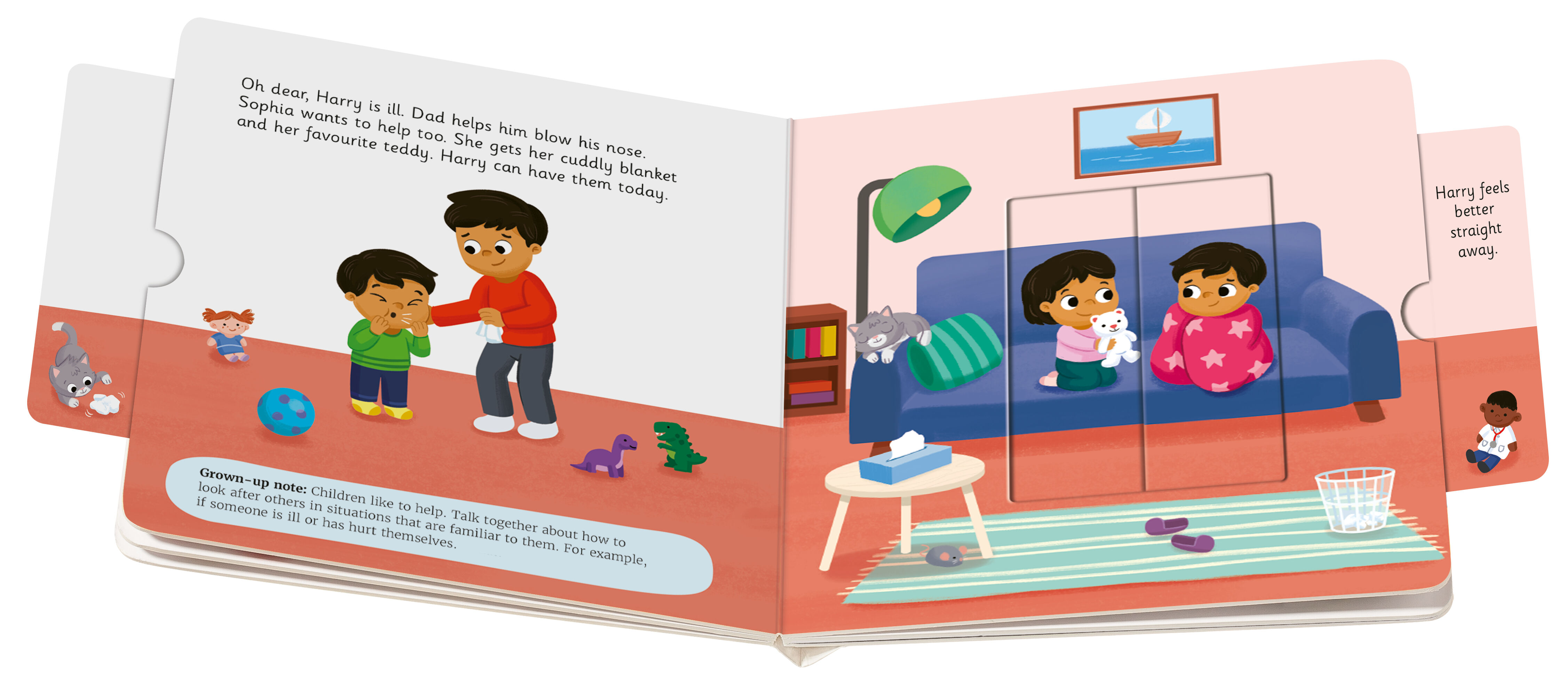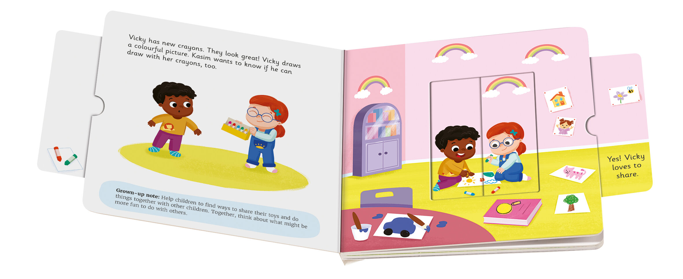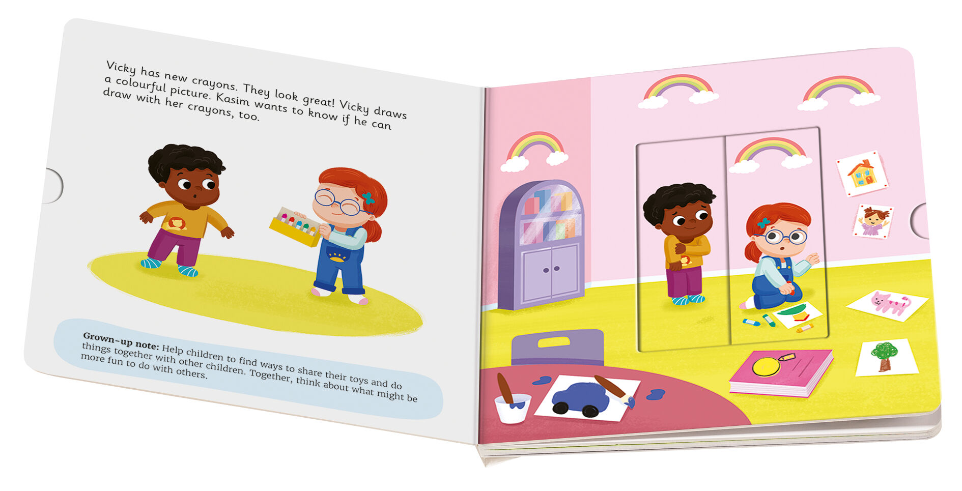 Vicky shares her pencils with Kasim and Sophia lovingly looks after Harry. This first book with sliders playfully guides children aged 18 months and older through their first social interactions. The sliders actively involve children in the action on the pages. Just pull the slider out and Liv and Kai are friends again.