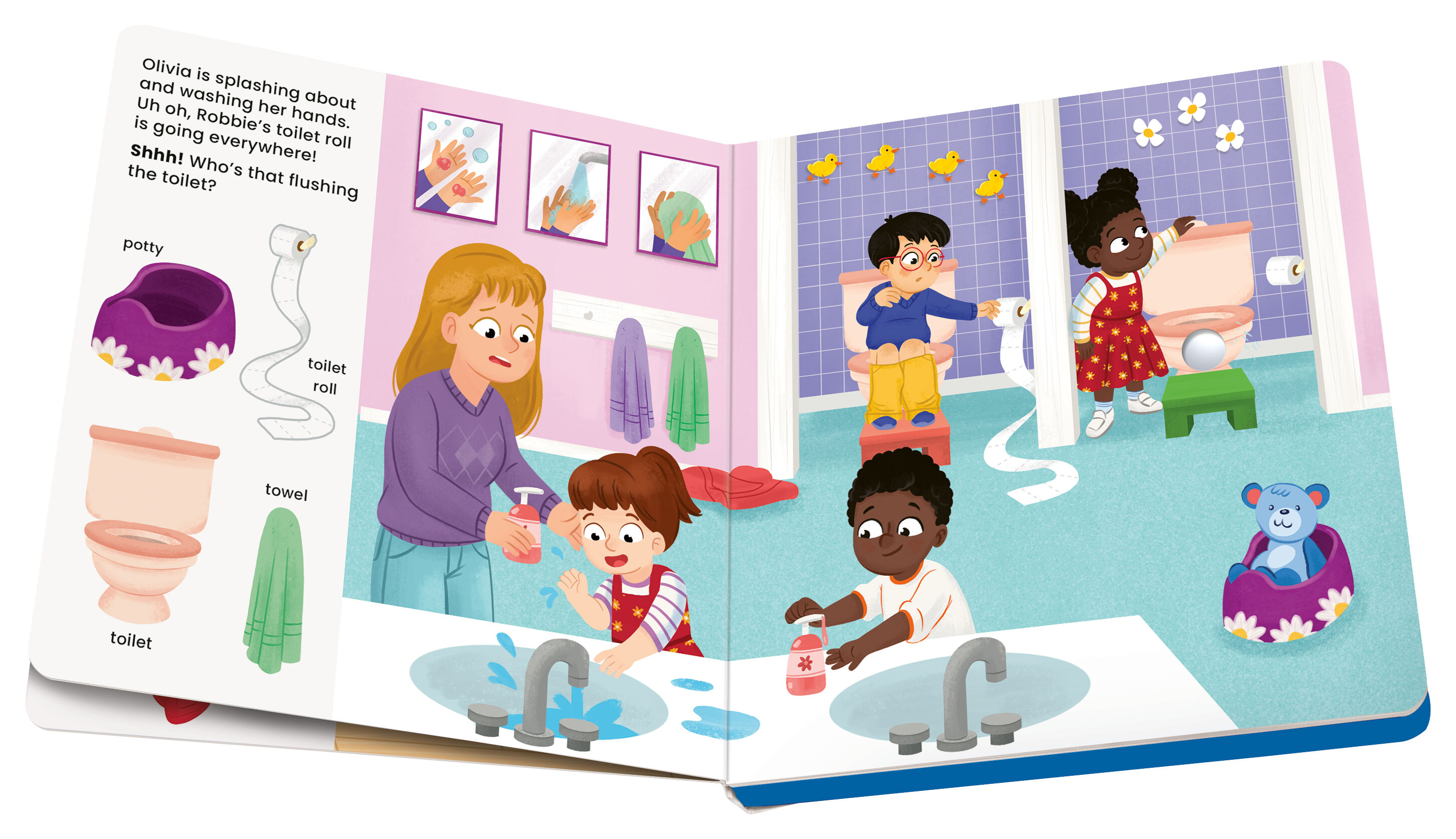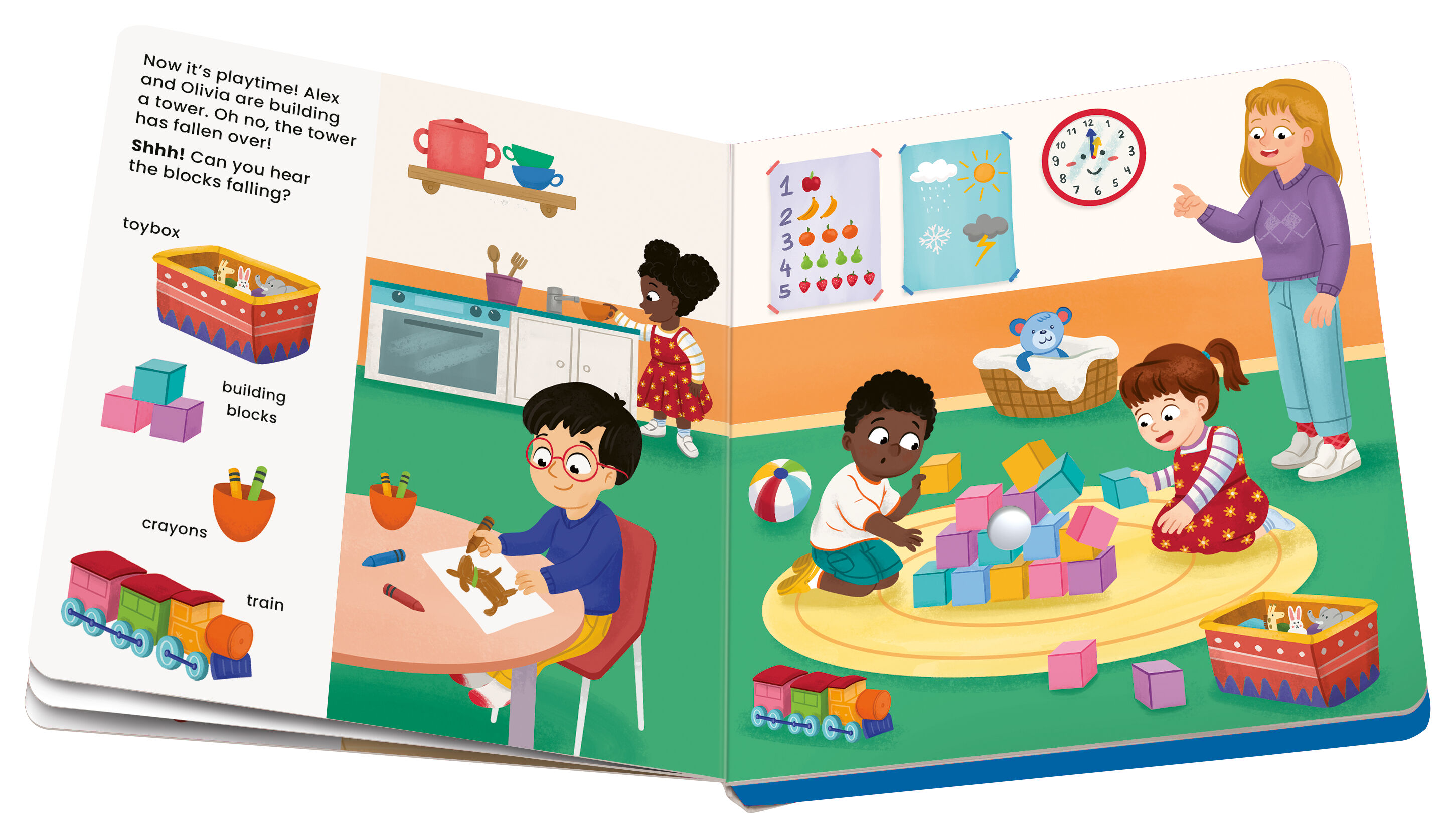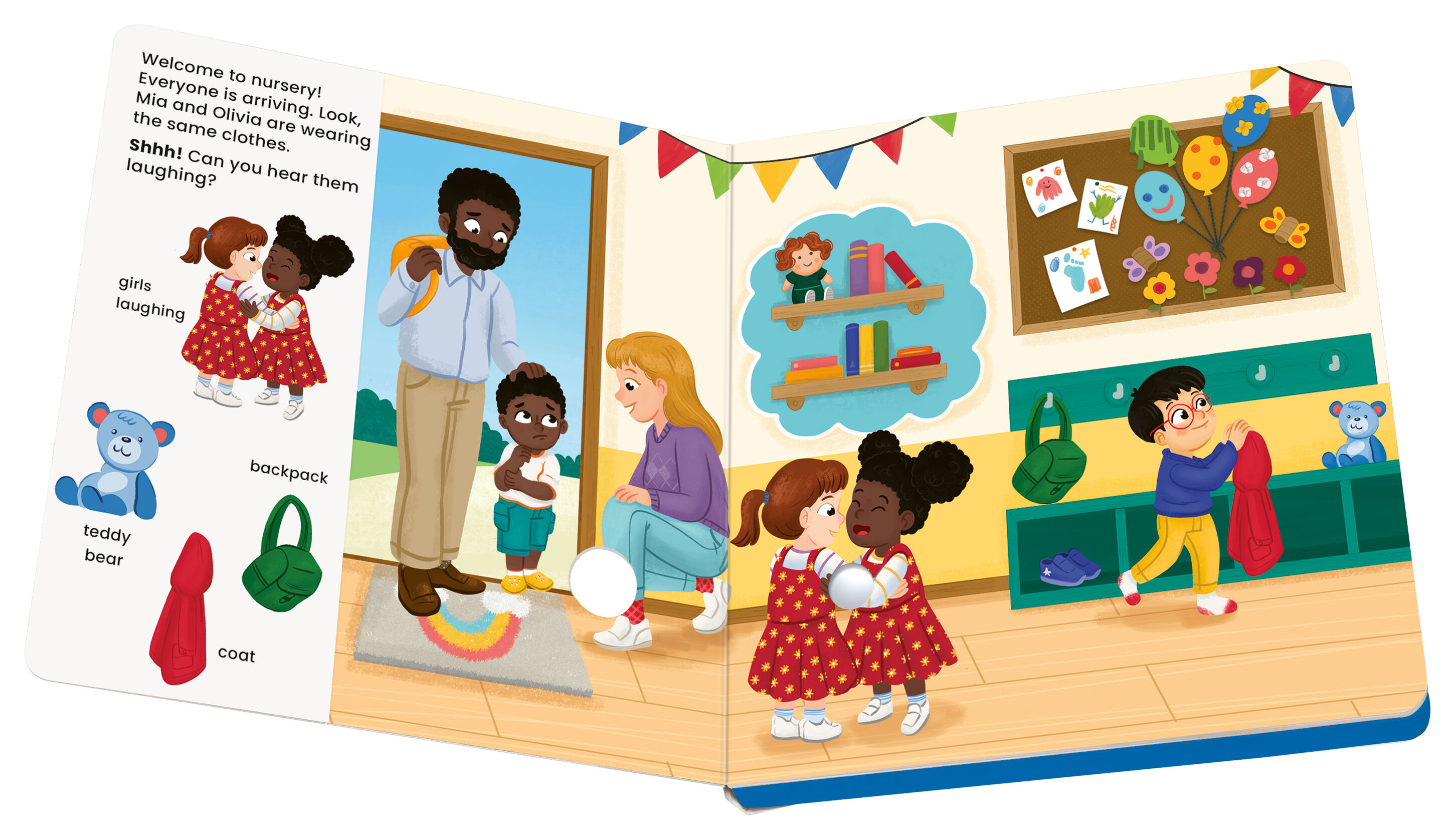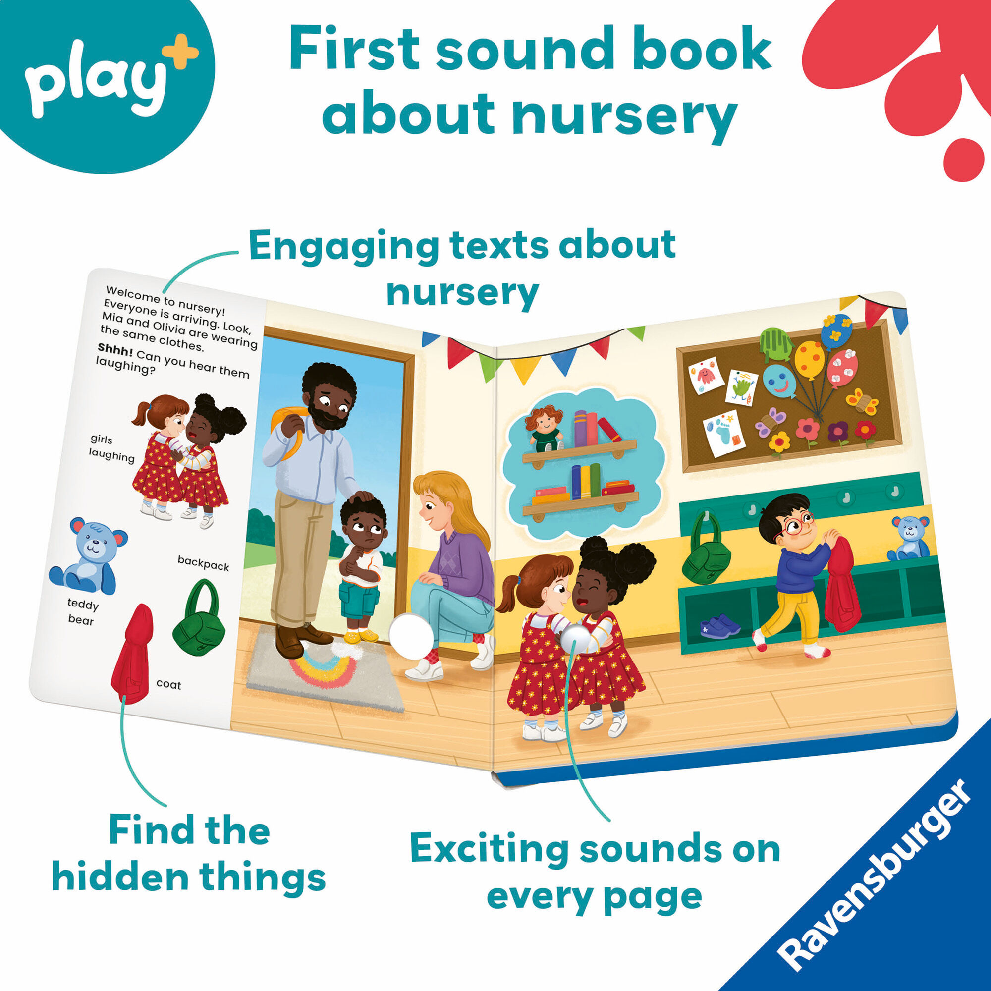 Have fun discovering the different sounds in nursery with this colourful search and find book. Press the buttons to bring the nursery to life and help children recognise the different noises they might hear, preparing them for what to expect in the nursery set...