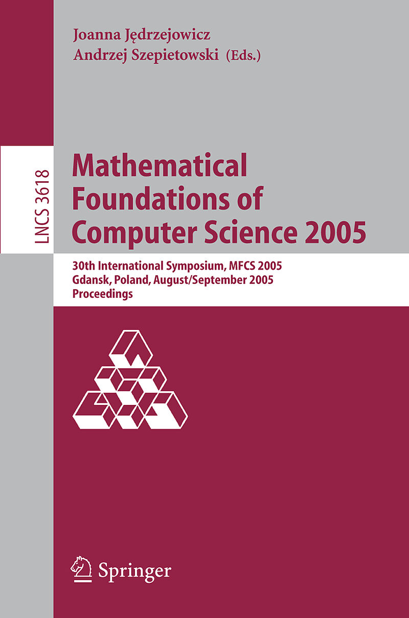 This volume contains the papers presented at the 30th Symposium on Mat- matical Foundations of Computer Science (MFCS 2005)held in Gdansk, Poland fromAugust29thto September 2nd,2005.TakingplacealternatelyintheCzech Republic, Slovakia and Poland, this year the ...This volume contains the papers presented at the 30th Symposium on Mat- matical Foundations of Computer Science (MFCS 2005)held in Gdansk, Poland fromAugust29thto September 2nd,2005.TakingplacealternatelyintheCzech Republic, Slovakia and Poland, this year the conference was organized by the Institute of Mathematics of Gdansk University. From the ?rst meeting in 1972 to this year s 30th event, the MFCS series has provided a basis for theoretical computer scientists to present their latest research results. The scope of the conference, consequently, covers all branches of theoretical computer science ranging from automata, algorithms, data str- tures, models of computation to complexity theory, also including arti?cial - telligence, computational biology, computational geometry and cryptography. The 137 submissions from 22 countries revealed a continued strong interest in the conference as well as the high-quality research results the MFCS series stands for. The Program Committee carefully selected 62 papers for presention at the conference complemented by 7 invited talks. The meeting took place at a conference hotel located on Sobieszewo Island, 15 km from Gdansk,o?ering both a beautiful landscapewith sandy beaches and forests and the possibility to explore the old Hanseatic city of Gdansk with its interesting history of over 1000 years.