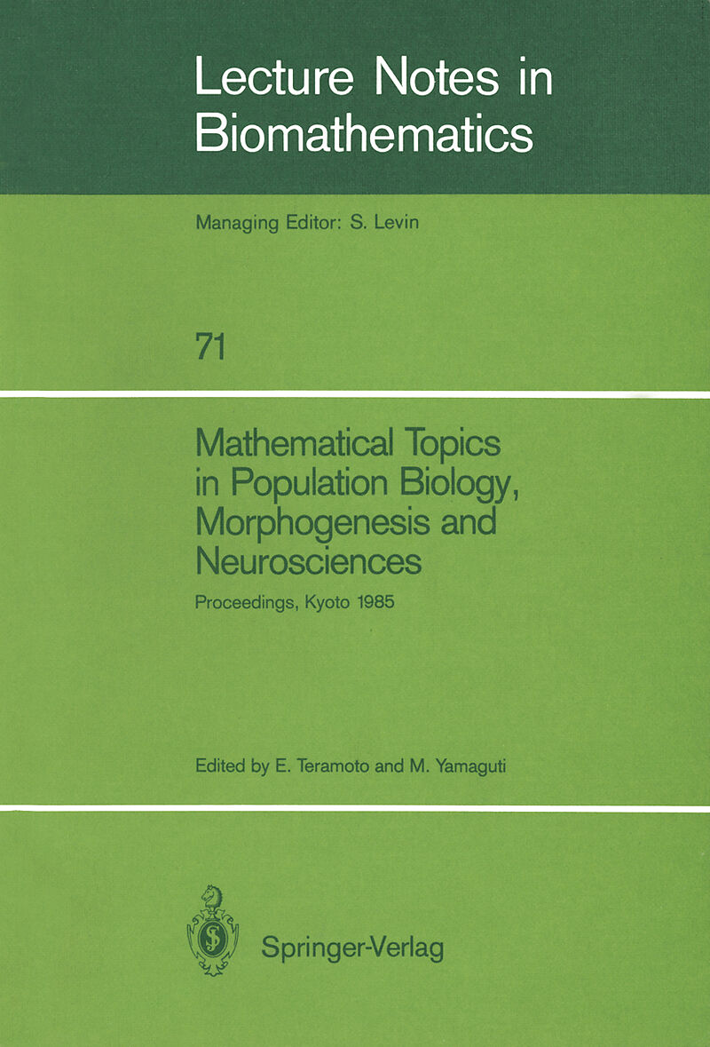 This volume represents the edited proceedings of the International Symposium on Mathematical Biology held in Kyoto, November 10-15, 1985. The symposium was or ganized by an international committee whose members are: E. Teramoto, M. Yamaguti, S. Amari, S.A. Lev...This volume represents the edited proceedings of the International Symposium on Mathematical Biology held in Kyoto, November 10-15, 1985. The symposium was or ganized by an international committee whose members are: E. Teramoto, M. Yamaguti, S. Amari, S.A. Levin, H. Matsuda, A. Okubo, L.M. Ricciardi, R. Rosen, and L.A. Segel. The symposium included technical sessions with a total of 11 invited papers, 49 contributed papers and a poster session where 40 papers were displayed. These Proceedings consist of selected papers from this symposium. This symposium was the second Kyoto meeting on mathematical topics in biology. The first was held in conjunction with the Sixth International Biophysics Congress in 1978. Since then this field of science has grown enormously, and the number of scientists in the field has rapidly increased. This is also the case in Japan. About 80 young japanese scientists and graduate students participated this time. . The sessions were divided into 4 ; , categories: 1) Mathematical Ecology and Population Biology, 2) Mathematical Theory of Developmental Biology and Morphogenesis, 3) Theoretical Neurosciences, and 4) Cell Kinetics and Other Topics. In every session, there were stimulating and active discussions among the participants. We are convinced that the symposium was highly successful in transmitting scientific information across disciplines and in establishing fruitful contacts among the participants. We owe this success to the cooperation of all participants.