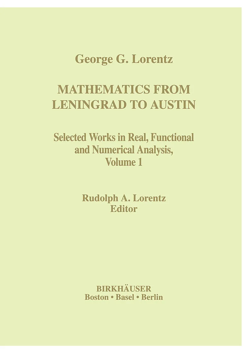 Volume 1.- Mathematics in a Broader Perspective (unpublished papers).- A Report on the University of Leningrad.- On the Work of the Mathematical Mind.- Proofs in Mathematics.- Writing Mathematical Books.- I. Summability and Number Theory.- G.G. Lorentz and the Theory of Summability.- [1] Über lineare Summierungsverfahren.- [8] Beziehungen zwischen den Umkehrsatzen der Limitierungstheorie.- [10] Über Limitierungsverfahren, die von einem Stieltjes-Integral abhangen.- [11] Eine Bemerkung über Limitierungsverfahren, die nicht schwächer als ein Cesàro-Verfahren sind.- [12] Fourier-Koeffizienten und funktionklassen.- [14] Tauberian theorems and Tauberian conditions.- [17] A contribution to the theory of divergent sequences.- [22] Direct theorems on methods of summability.- [23] (with K. Knoop) Beiträge zur absoluten.- [28] Direct theorems on methods of summability.- [29] Riesz methods of summation and orthogonal series.- [31] (with M.S. Macphail) Unbounded operators and a theorem of A. Robinson.- [33] Multiplicity of representation of integers by sums of elements of two given sets.- [36] (with A.G. Robinson) Core-consistency and total inclusion for methods of summability.- [37] Tauberian theorems for absolute summability.- [38] On a problem of additive number theory.- [39] Borel and Banach properties of methods of summation.- [42] (with K.L Zeller) Über Paare von limitierungsverfahren.- [43] (with K.L Zeller) Series rearrangements and analytic sets.- [44] (with P. Erdös) On the probability that n and g(n) are relatively prime.- [45] (with B.J. Eisenstadt) Boolean rings and Banach lattices.- [54] (with K.L. Zeller) Strong and ordinary summability.- [56] (with K.L. Zeller) Summation of sequences and series.- [80] (with K.L. Zeller) o-but not O-Tauberian theorems.-II. Interpolation.- The work of G.G. Lorentz on Birkhoff interpolation.- [76] Birkhoff approximation and the problem of free matrices.- [82] The Birkhoff interpolation theorem: New methods and results.- [84] (with K.L Zeller) Birkhoff interpolation problem; coalescence of rows.- [85] Zeros of splines and Birkhoff's kernel.- [88] Independant knots in Birkhoff's interpolation.- [91] Coalescence of matrices, regularity and singularity of Birkhoff interpolation problems.- [94] (with S.D. Riemenschneider) Birkhoff quadrature matrices.- [95] Symmetry in Birkhoff matrices.- [97] (with S.D. Riemenschneider) Probabilistic approach to Schoenberg's problem in Birkhoff interpolation.- [99] (with S.D. Riemenschneider) Birkhoff interpolation: some applications of coalescence.- [102] Independent sets of knots and singularity of interpolation matrices.- [103] (with R.A. Lorentz) Probability and interpolation.- [104] (with N. Dyn and S.D. Riemenschneider) Continuity of the Birkhoff interpolation.- [105] The analytic character of the Birkhoff interpolation polynomials.- [109] (with K. Jetter and S.D. Riemenschneider) Rolle theorem in spline interpolation.- [114] (with R.A. Lorentz) Multivariate interpolation.- [116] (with R.A. Lorentz) Solvability problems of bivariate interpolation.- [117] Classic interpolation by polynomials in two variables.- [118] (with R.A. Lorentz) Solvability problems of bivariate approximation II: Applications.- [122] Solvability of multivariate interpolation.- [124] Notes on approximation.- [126] (with R.A. Lorentz) Bivariate Hermite interpolation and application to algebraic geometry.