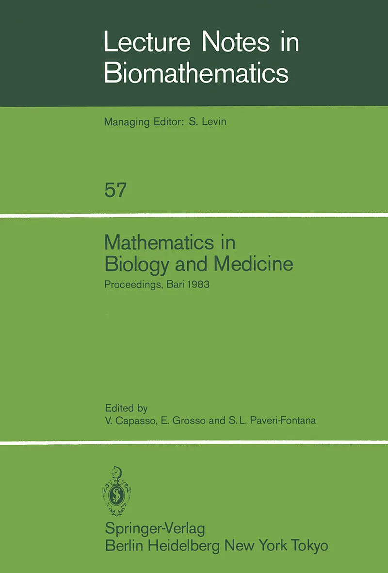 These Proceedings contain a large part of the papers presented at the International Conference "Mathematics in Biology and Medicine" organized by the Dipartimento di Matematica and the Istituto di Igiene at the University of Bari, Italy, July 18-22, ...These Proceedings contain a large part of the papers presented at the International Conference "Mathematics in Biology and Medicine" organized by the Dipartimento di Matematica and the Istituto di Igiene at the University of Bari, Italy, July 18-22, 1983. The main objective of the Conference was to bring together scientists in pure and applied mathematics and scientists in biology and medicine. The purpose was to exchange ideas and discuss the common problems encoun~red in the formulation, ana lysis and numerical treatment of mathematical models in the biomedical sciences. Si mulation methods and problems of validation of models vs. experimental data were al so treated. SUrveys on recent mathematical results motivated by biological questioffi were given. Altogether,we think that a balance between mathematical and biomedical aspects was maintained. The Scientific Committee consisted of E. Biondi (Milano), P. Colli-Franzone (Udine), I. Galligani (Bologna), M. Iannelli (Trento), G. Koch (Roma), E. Marubini (Milano), C. Matessi (Pavia), M. Primicerio (Firenze), L.M. Ricciardi (Napoli), R. Rinaldi (Milano), A. Zampieri (Roma), and the European Liaison Committee consisted of R.M. Anderson (United Kingdom), N.T.J. Bailey (Switzerland), O. Diekmann (The Netherlands), K. Dietz (F. R. Germany), K.P. Hadeler (F· . . R. Germany), J.P. Kernevez (France).