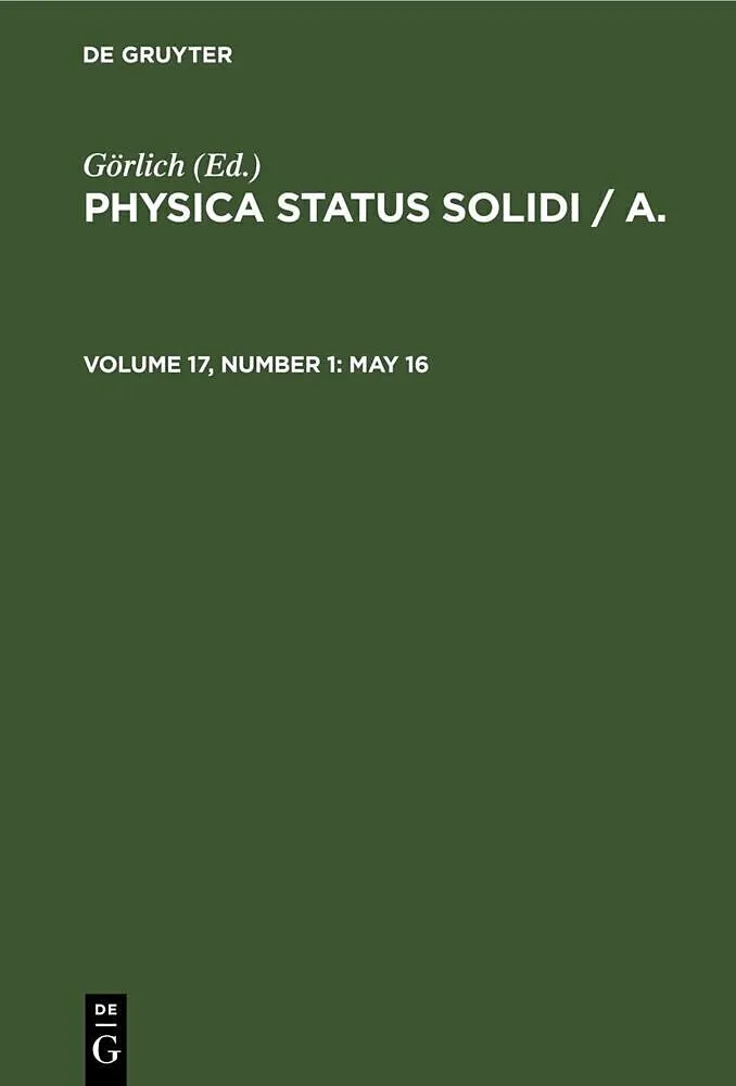 Frontmatter -- Classification Scheme -- Author Index -- Contents -- Review Article -- Photoelectric Phenomena in Amorphous Chalcogenide Semiconductors -- Original Papers -- Virtual Recharge: Mechanism of Radiationless Transition in Scheelite and Fergusonite Type Crystals Doped with Rare-Earth Ions -- Coupling Energy Dependence of Spectral Properties in Weak Superconducting Contacts -- Dielectric Properties of Ba(ClO3)2 H2O Single Crystal -- Antiphase Domain Boundaries in Pd3Mn -- Measurements of the Physical Properties of Thin Bi Films from 180 to 40000 A -- Cross Slip of Superlattice Dislocations -- A Study of the Oxidation and Reduction by Water Vapour of Si (111) Surfaces Using Auger Electron Emission -- Thermochemical Calculations of the System AsH3-PH3-HCl-Ga-H2 for GaAsP Yapour Growth -- Possible Tunneling in Ferromagnetics with Extraordinary Viscosity -- Threshold Theory of Laser Generation in p-n Junctions with Exponential Band Tails -- The Elastic Constants of MnAs -- Dissipated Energy during Cyclic Deformation -- On the Influence of Donor-Acceptor Interaction upon Recombination and Electrical Instability in Semi-Insulating GaAs (Cr) -- Neutron Diffraction Effect on the Rocking Curve of a Vibrating Single Crystal -- Direct Observation of Extended Linear Defects in MgF2-Doped Niobium Oxides -- Magnetic Properties of Liquid-Phase Epitaxial Films of Y3-xCdxFe5-yGayO12 for Optical Memory Applications -- Growth and Optical Absorption Spectra of the Layer-Type Trichalcogenides ZrS3 and HfS3 -- Photoelectric Properties of Silver Bromide-Semiconductor Structures -- Structures magnétiques sinusoïdales et hélicoïdales de la terre rare dans TMn2O5 -- Calculation of the Atomic Volumes of Fe-Ni and Fe-Co Alloys -- Field Effect on the Germanium-Electrolyte Interface -- Low Temperature Thermal Conductivity of Zinc Oxide -- Thermally Stimulated Discharge Current Studies in Shellac Wax Electrets -- Dissociated Dislocations in Germanium -- X-Ray Observations of Induced Dislocations at Simple Planar Structures in Silicon -- Oxygen Adsorption on the (111) Face of Silver -- On the Determination of the Carrier Concentration of GaAs1-xPx -- Dislocation Dynamics in LiF and MgO Single Crystals -- The Epitaxial Growth and Structure of Films of CdTe Evaporated onto Ge -- Stresses of Hexagonal Screw Dislocation Arrays (III) -- Magnetic Relaxation in Neutron-Irradiated Iron -- Migration of Sr2+ Impurity-Vacancy Dipoles in RbCl -- Point Defects in Highly Deformed Yanadium -- A Mössbauer Study of the Hyperfine Interactions in Intermetallic, Ferromagnetic, and Ferroelectric Compounds of Antimony -- Size of Subgrains Arising in Single Crystals Grown from the Melt and Dimensions of Dislocation Cells in Deformed Crystalline Materials -- Silicon Homoepitaxy with Ion Sputtering (I) -- Surface Luminescence in GaAs at Laser Excitation -- Precision Lattice Parameter Studies of Ion-Implanted Silicon -- Short Notes -- A Dislocation "Etch-Memory" Effect in Gallium Arsenide -- Heterodiodes of ZnTe Thin Films on GaAs, InAs, and GaP Single Crystals Prepared by Vacuum-Deposition Epitaxy -- A Modified Method of Limited X-Ray Topographs -- Photovoltaic Properties of ZnS Crystals -- Analysis of Interaction between a Magnetic Saturated Overlay and a Magnetic Bubble -- Low Frequency Vibrations in Lepidocrocite (y-FeOOH) Studied by Infrared Absorption -- Piezoresistive Coefficients in Silicon Diffused Layers -- Uber die Rolle der F- und F'-Zentren in der Exoemission von BeO -- On the Threshold Law for the Photoemission from the Organic Solid -- Spectroscopic Properties of La2Be2O5:Nd3+ Single Crystals -- Colour Centres in YAlO3:Tr3+ Crystals -- Experimental Test of Sv = 4 kT(U/I) for Space-Charge-Limited Current of Holes in Silicon -- On the Calculation of the Limiting Thickness of a Stable Coherent Two-Dimensional Epitaxial Layer -- The Dependence of Raman Scattering Cross Section on Laser Intensity for Semiconducting NaxWO3 Crystals -- Study of Electrical Con